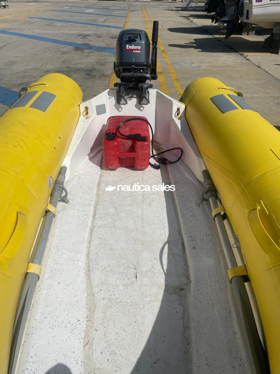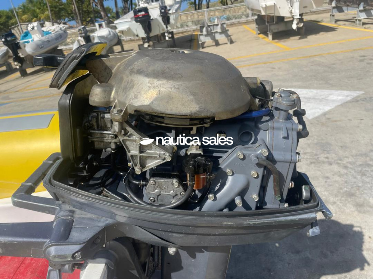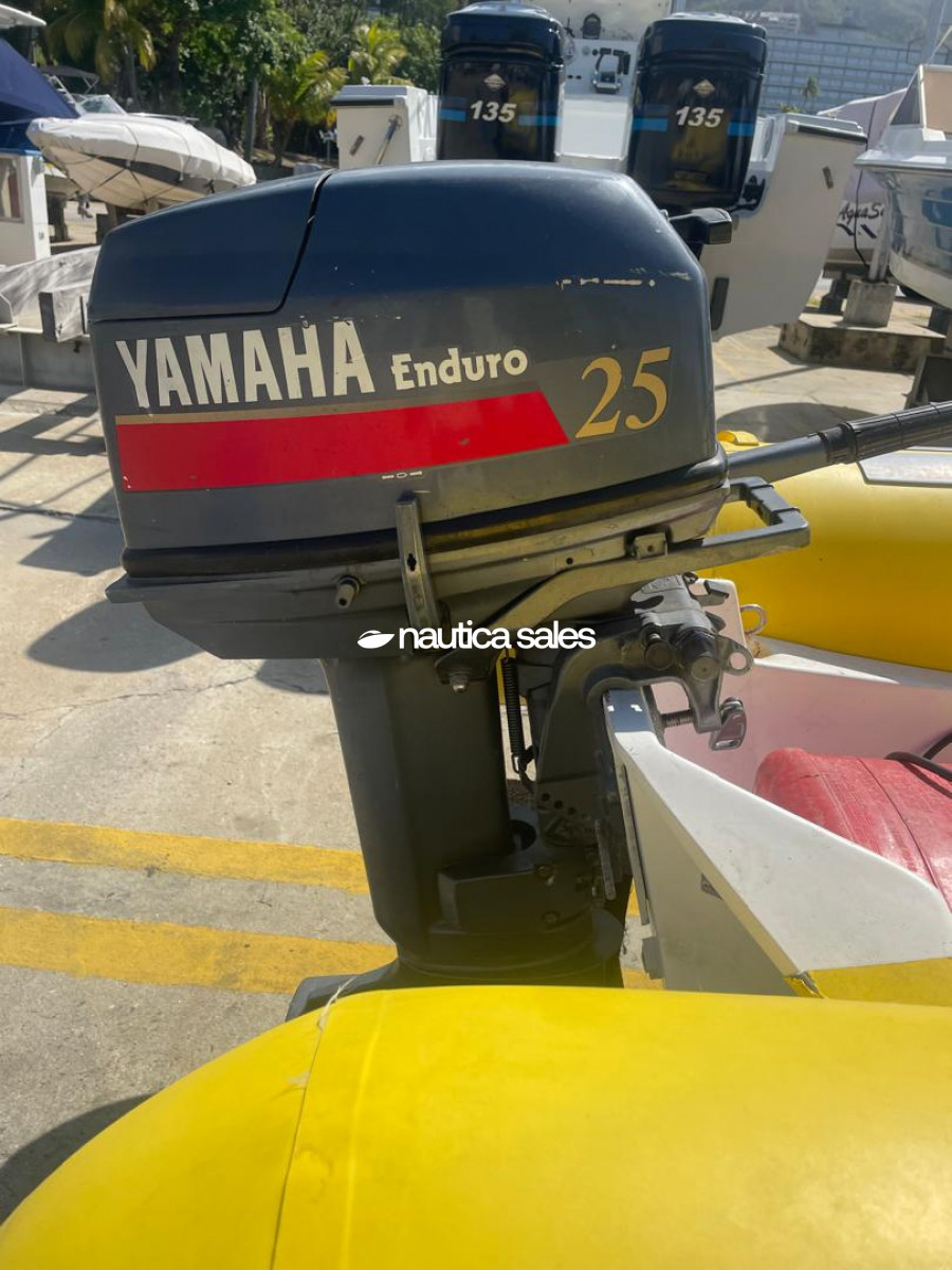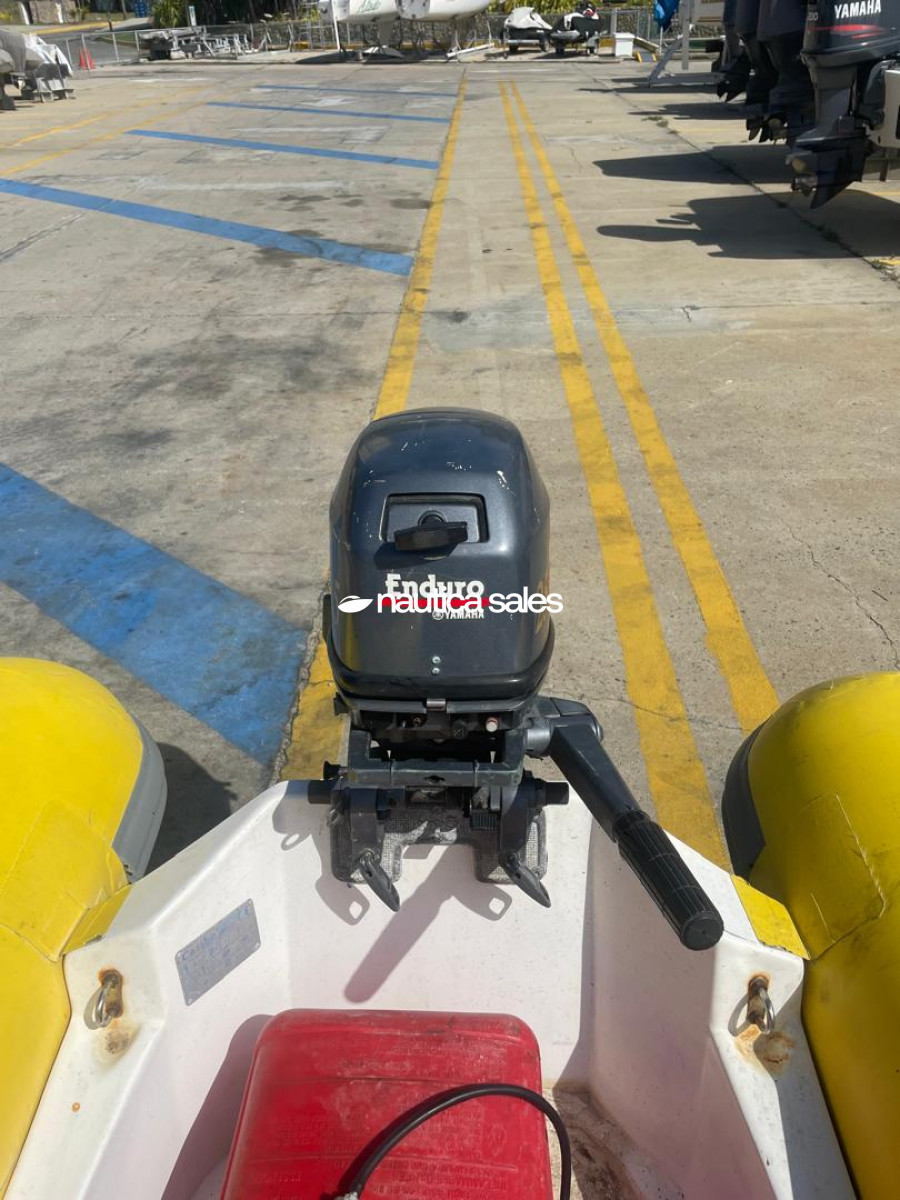 El bote de goma inflable de color amarillo está en buen estado, tiene dos remos, bidón de gasolina, ancla de 3,5 Kg con 1 m de cadena y 30 m cabo, además tiene cobertor y se entrega el bote con 4 chalecos nuevos.