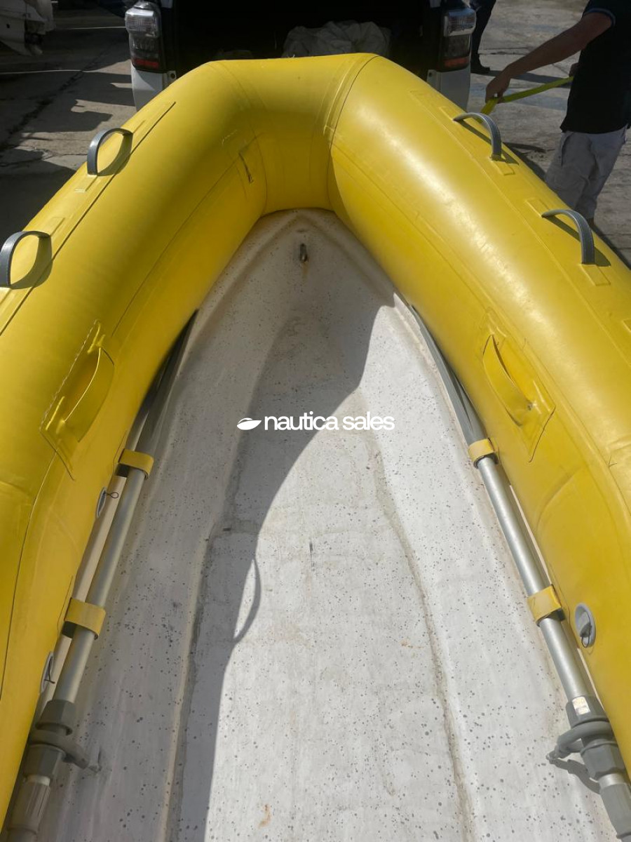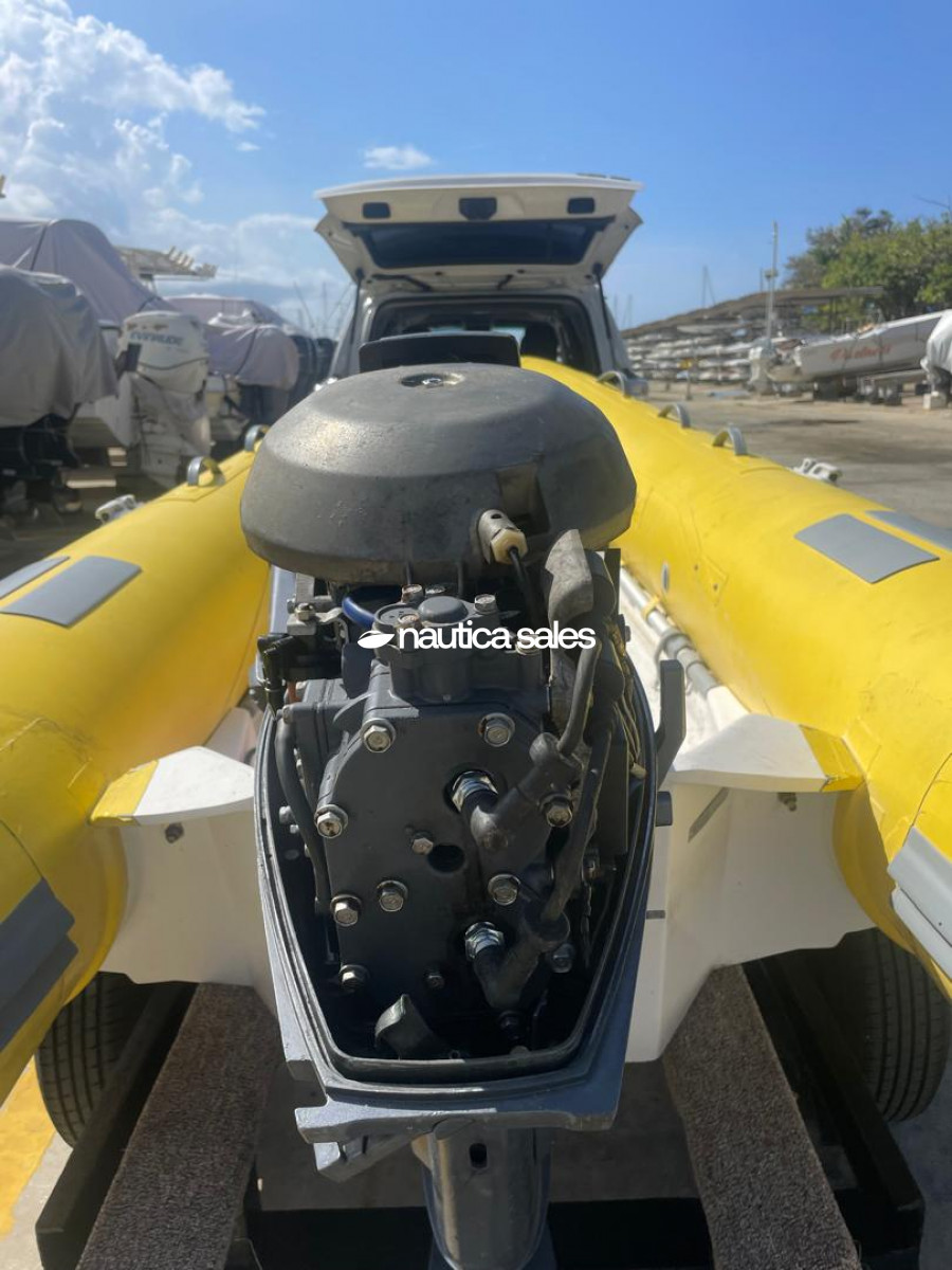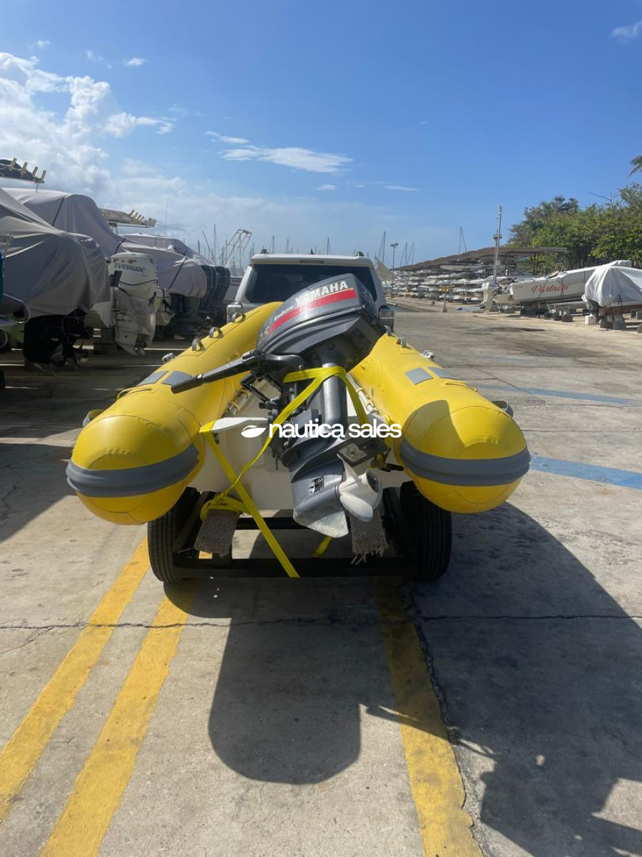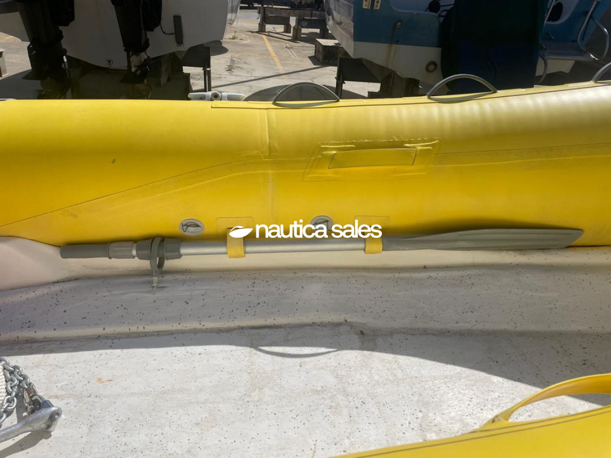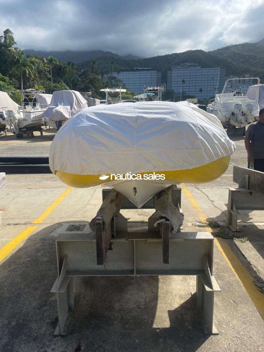 El bote de goma inflable de color amarillo está en buen estado, tiene dos remos, bidón de gasolina, ancla de 3,5 Kg con 1 m de cadena y 30 m cabo, además tiene cobertor y se entrega el bote con 4 chalecos nuevos.