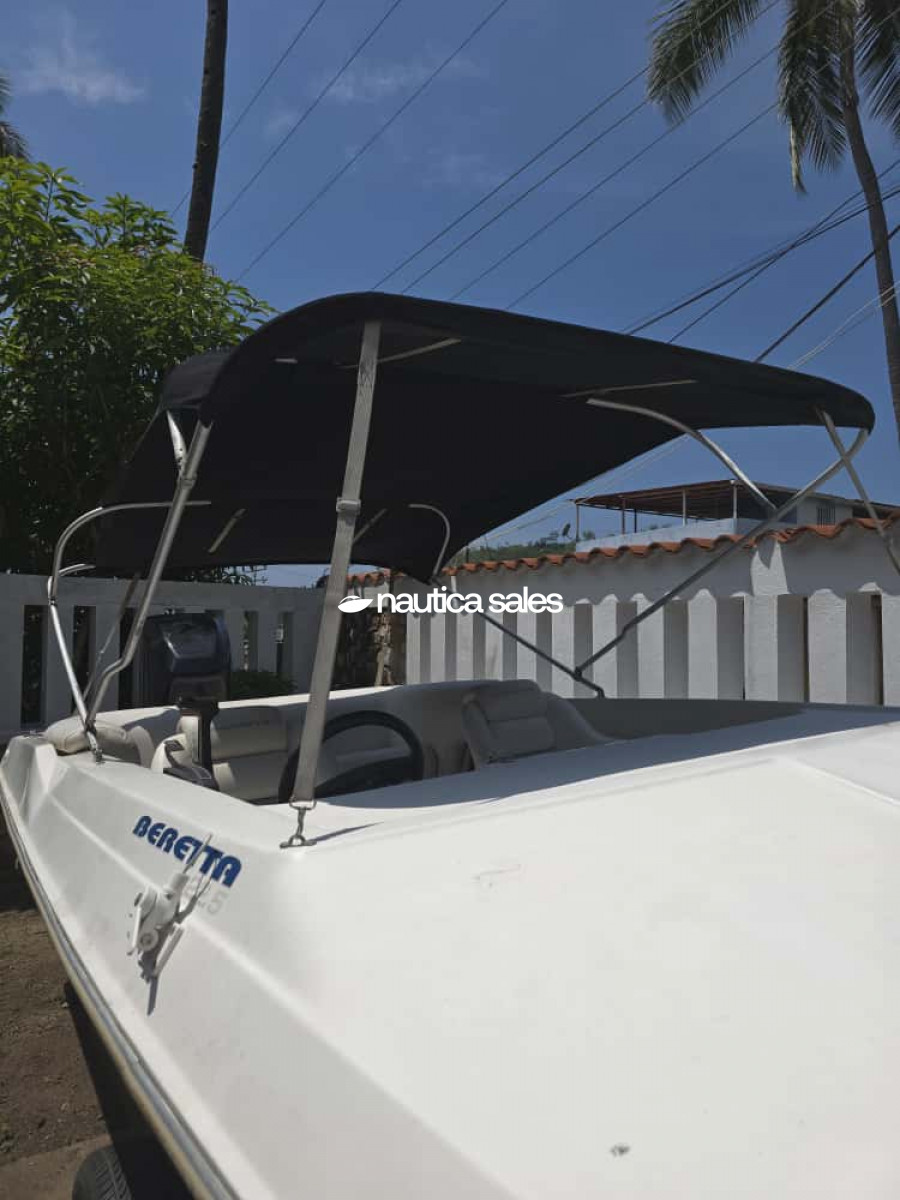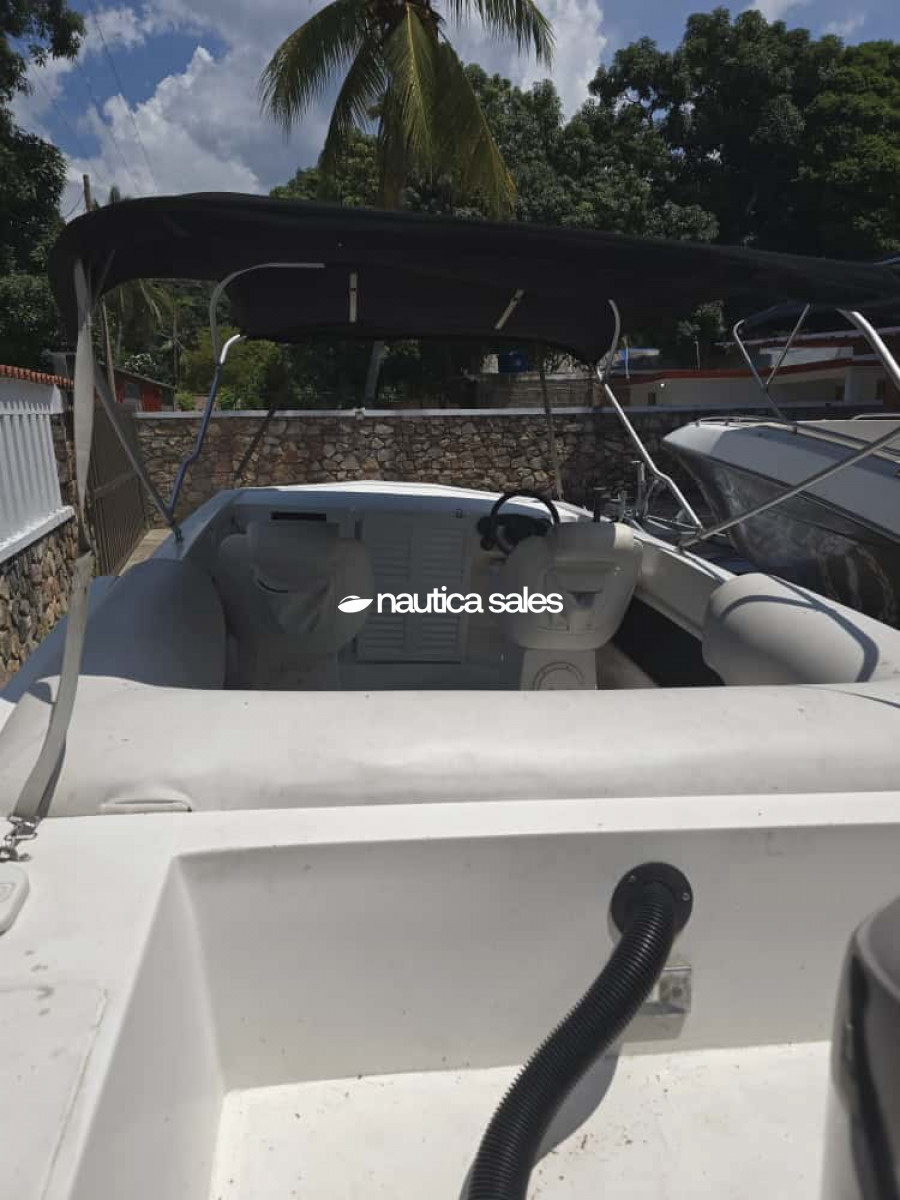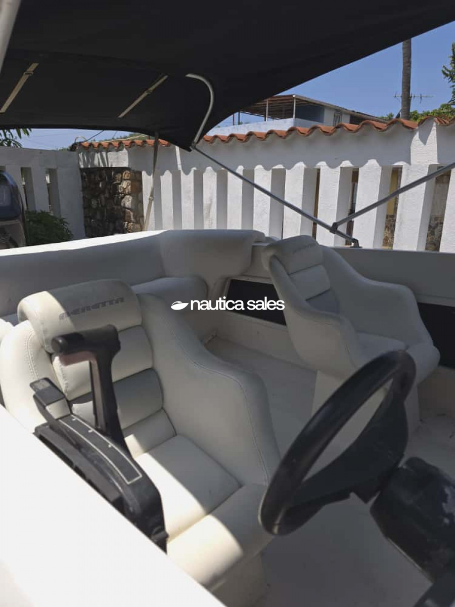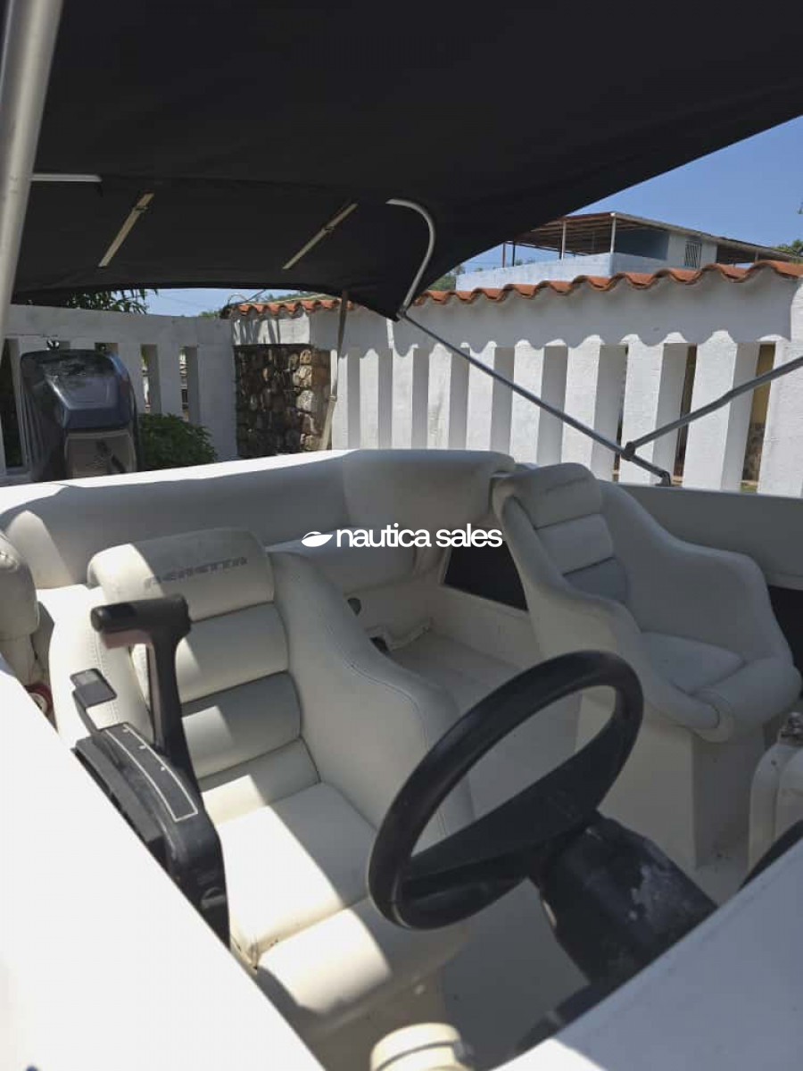 La embarcación tiene camarote en proa, centro de mando a estribor, área social en popa con tapicería de color blanco en buen estado y toldo retraíble.