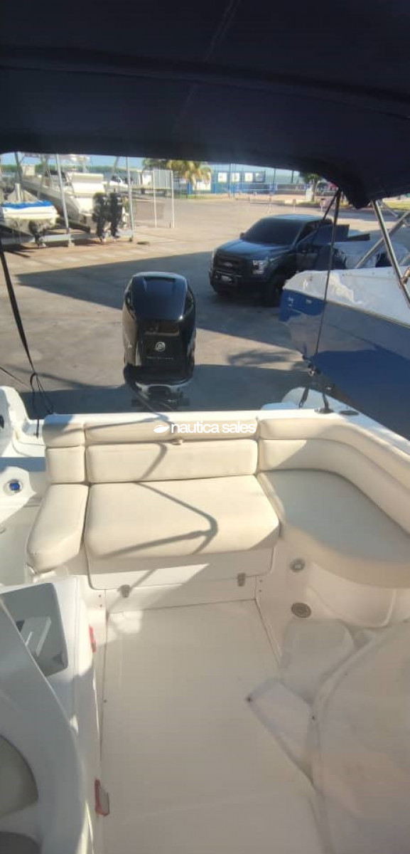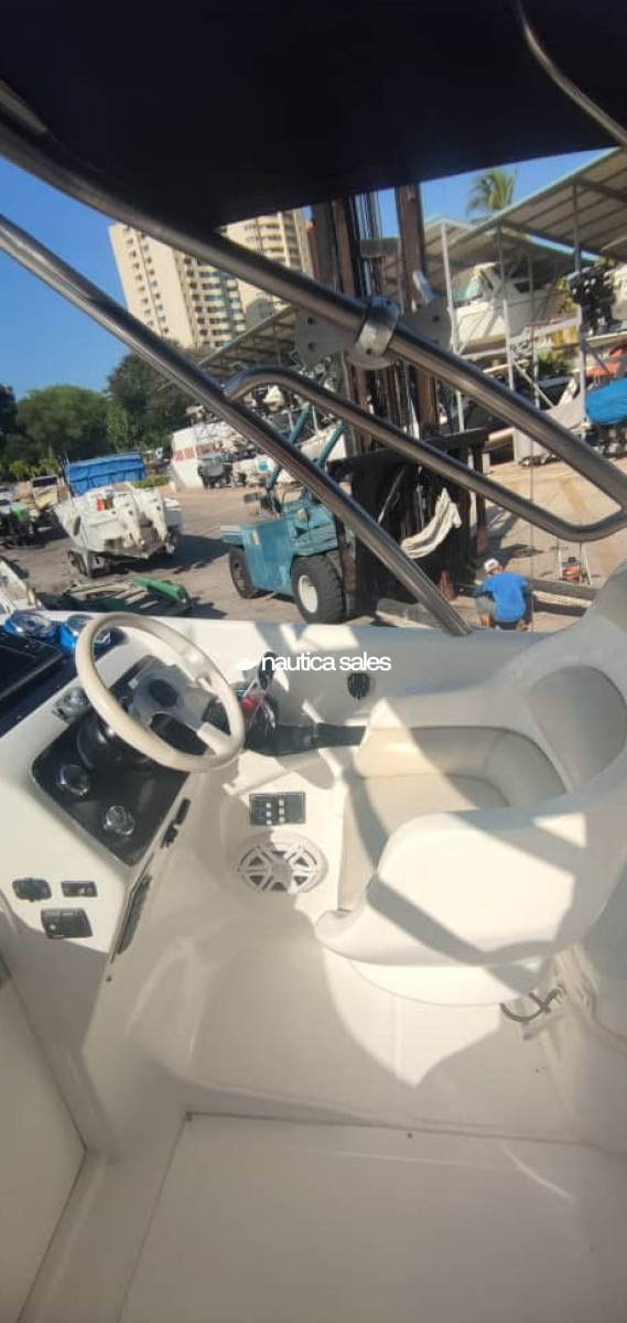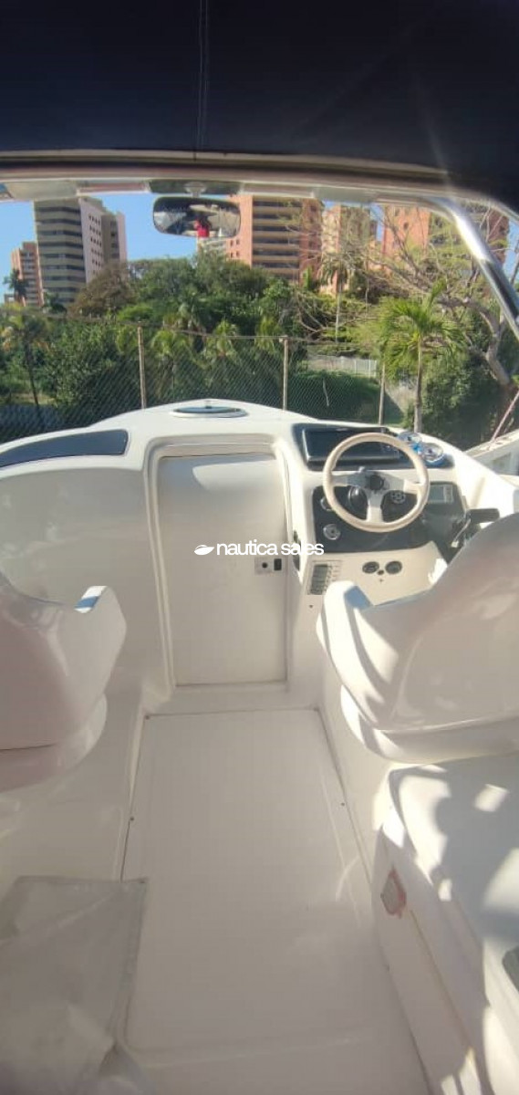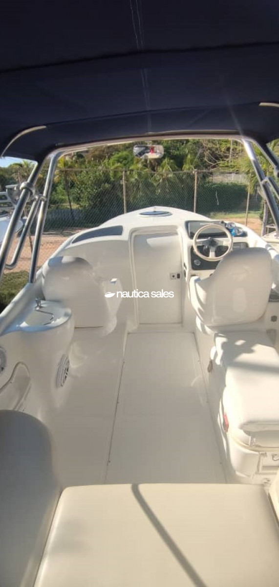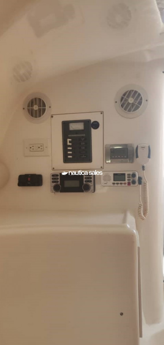 El casco se encuentra en excelente condición; el área social de popa tiene butacas con tapicería de color blanco en buen estado al igual que la lona y la estructura tubular del toldo retráctil. El centro de mando está ubicado a estribor y tiene relojería, radio VHF, profundímetro y pantalla 12” Raymarine.