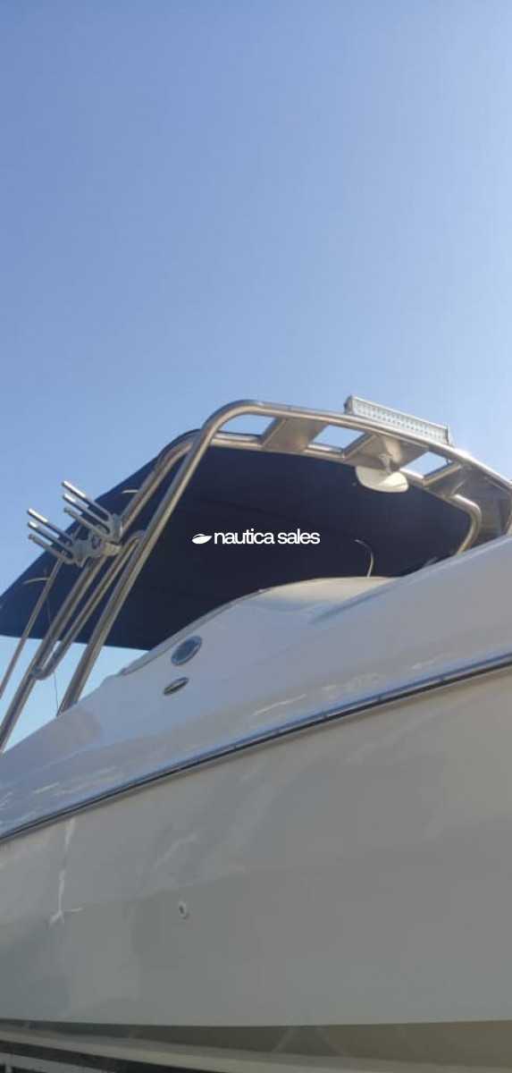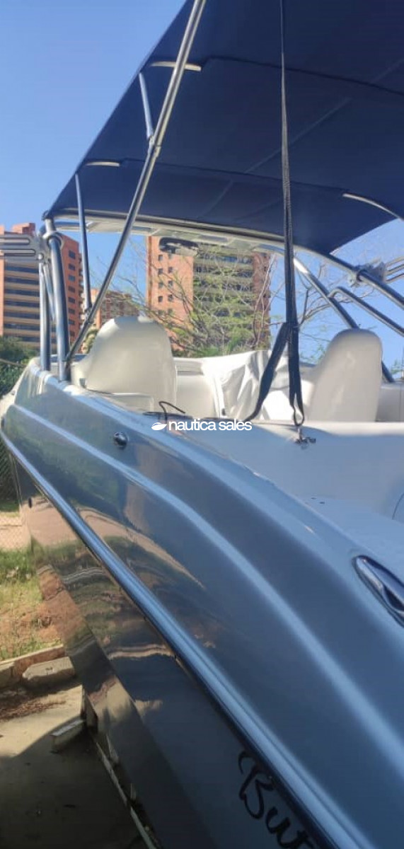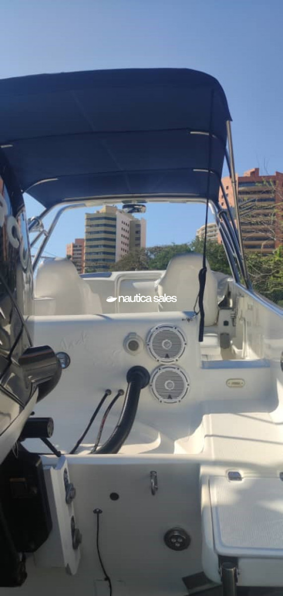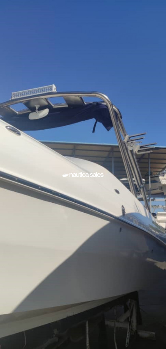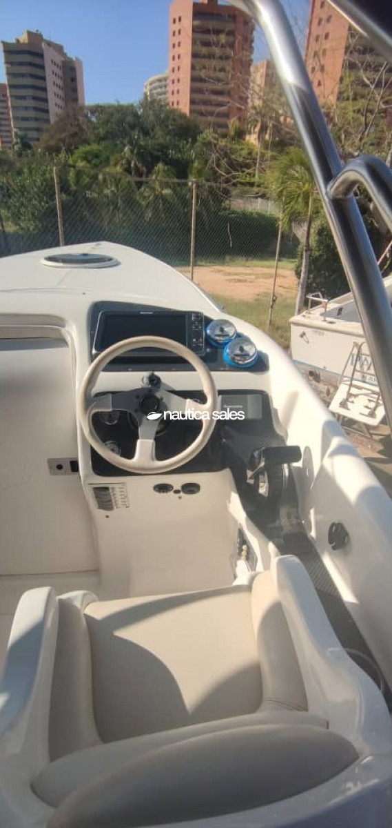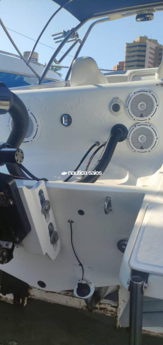 El casco se encuentra en excelente condición; el área social de popa tiene butacas con tapicería de color blanco en buen estado al igual que la lona y la estructura tubular del toldo retráctil. El centro de mando está ubicado a estribor y tiene relojería, radio VHF, profundímetro y pantalla 12” Raymarine.