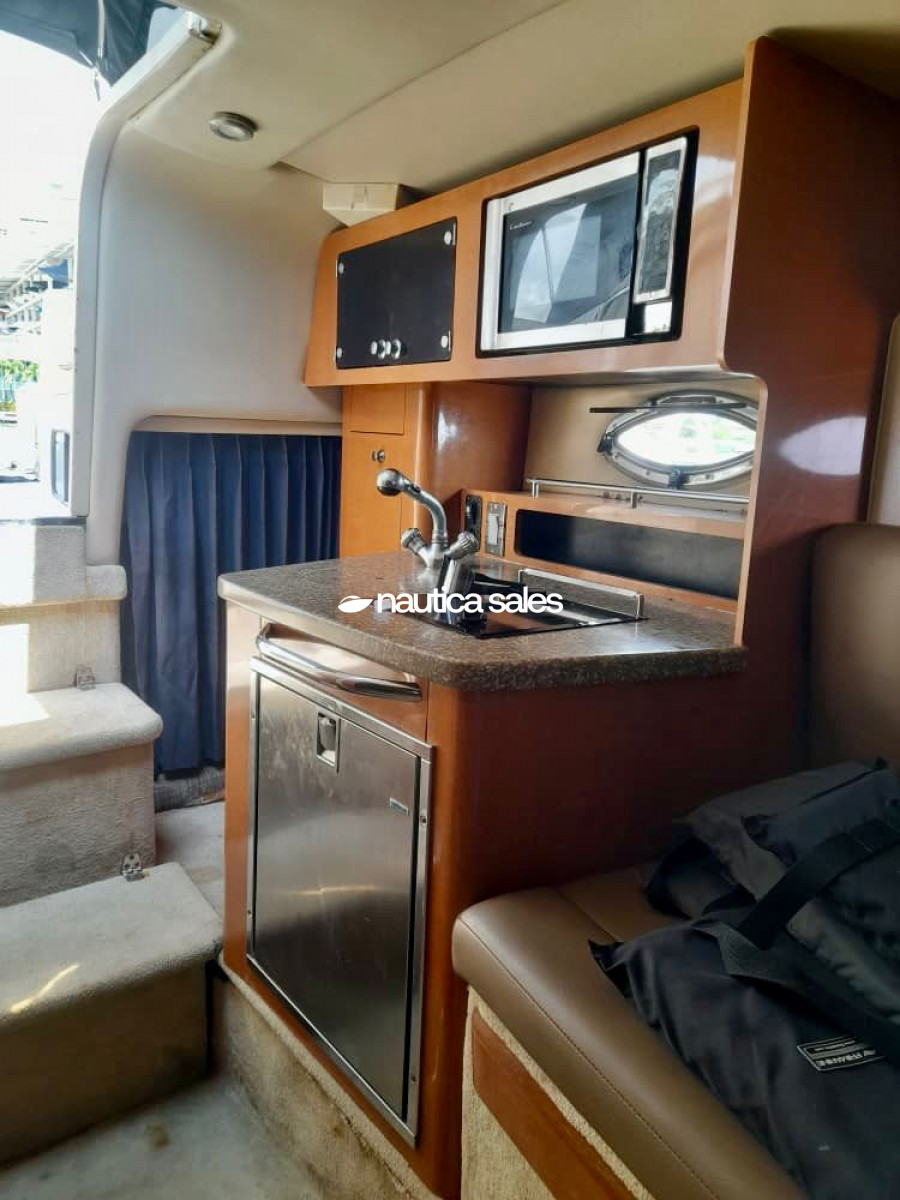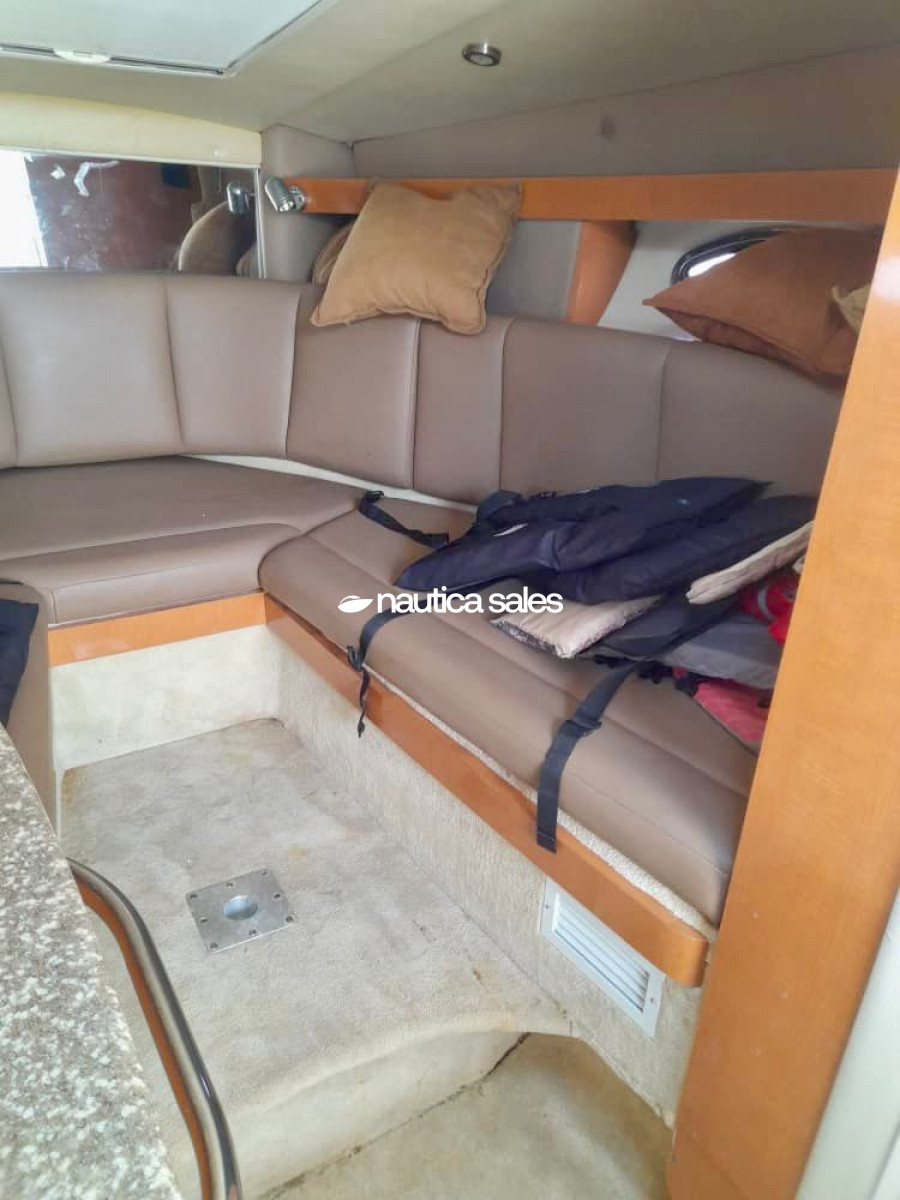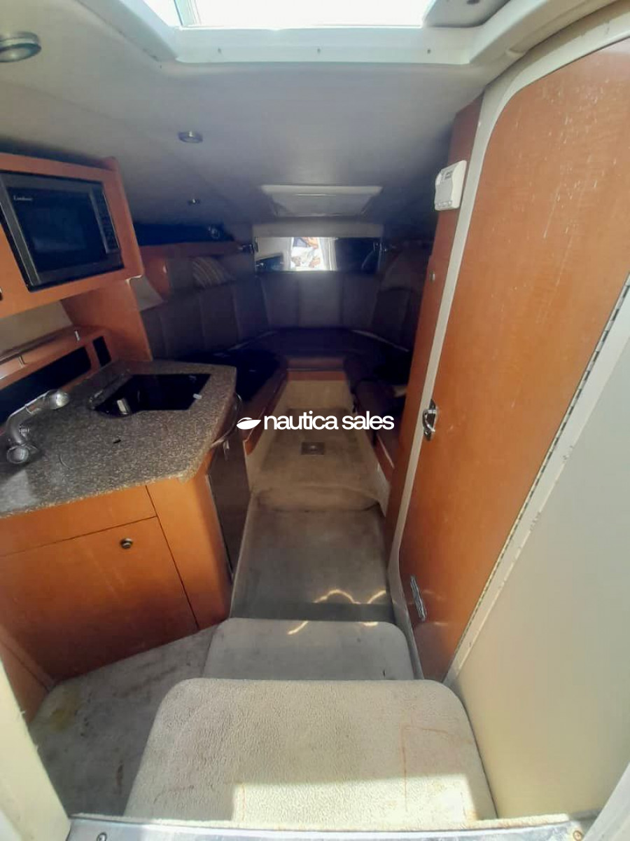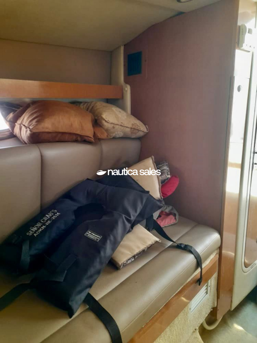 En proa tiene un camarote con aire acondicionado, cocina integrada, microondas, lavacopas; un baño completo ( inodoro, lavamanos y ducha).