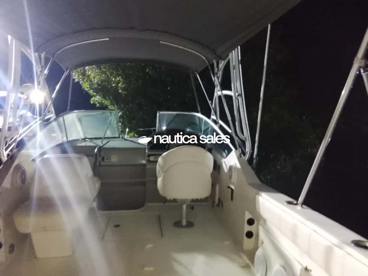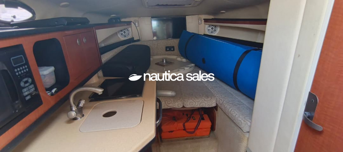 La embarcación tiene área social en popa con asientos de color blanco en buenas condiciones al igual que el toldo. El centro de mando está ubicado a estribor co los equipos para la ayuda en la navegación: relojería Smart craft original Mercury, radio VHF y brújula. En la proa tiene camarote con aire acondicionado y cocina integrada de una hornilla, microondas, nevera, lavacopas y un baño.