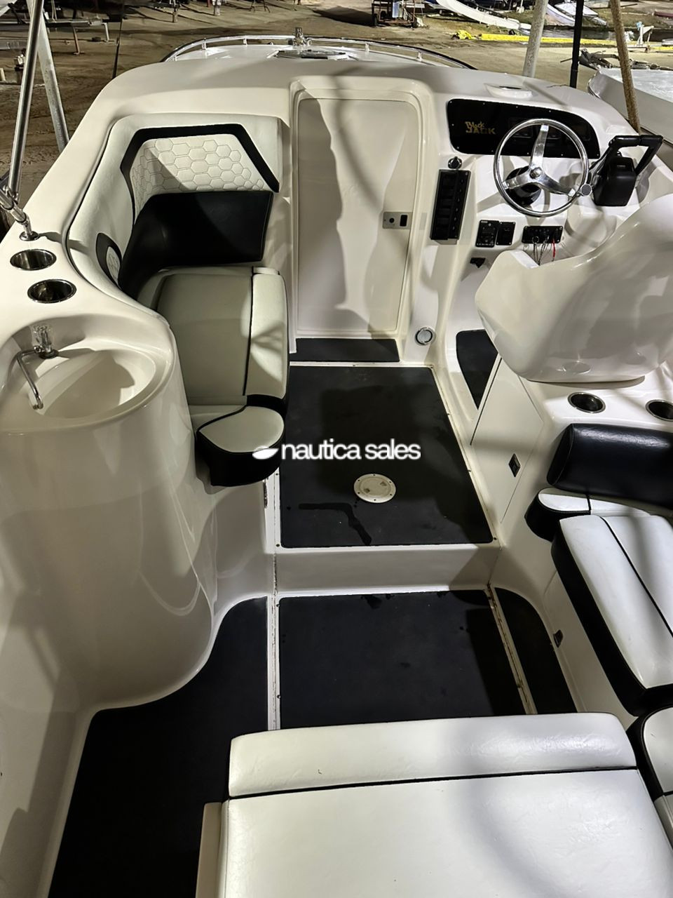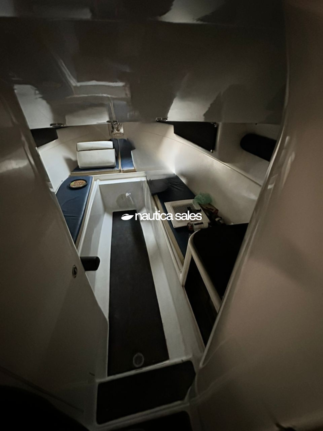 El centro de mando está ubicado a estribor y cuenta con los equipos para la ayuda en la navegación. La embarcación tiene área social en popa, asientos con tapicería de color blanco y negro en muy buenas condiciones al igual que la estructura tubular y la lona del toldo. La lancha posee un camarote en proa con aire acondicionado y un baño.