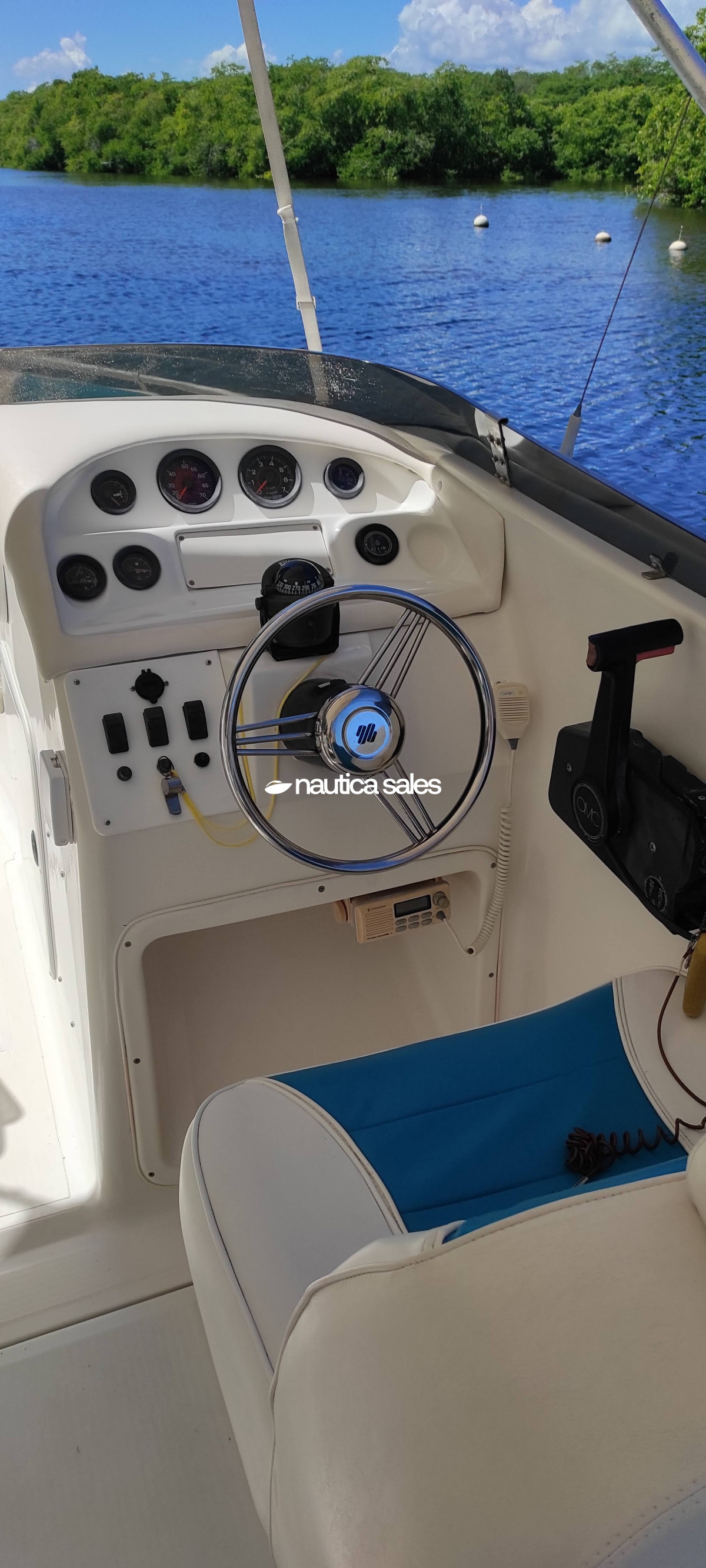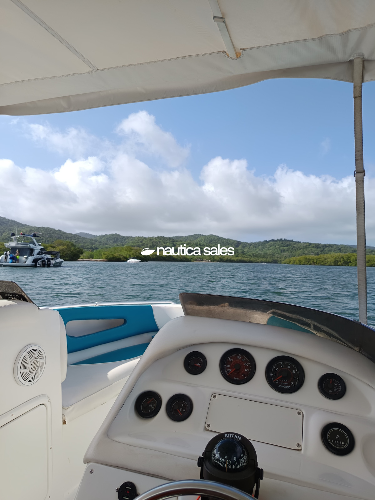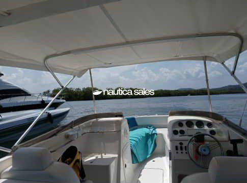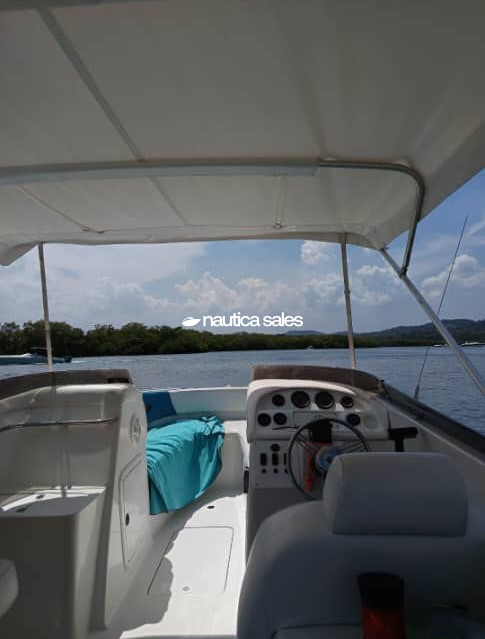 La lancha tiene centro de mando a estribor con todos los equipos para la ayuda en la navegación: relojería operativa, radio VHF y brújula Ritchie; área social en proa y popa con asientos de color azul y blanco con detalles de uso, techo de lona blanca en buen estado al igual que la estructura tubular que lo sostiene.