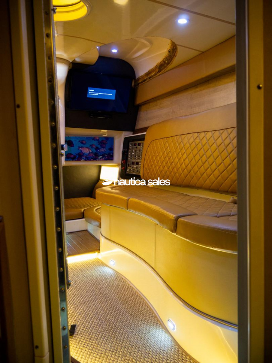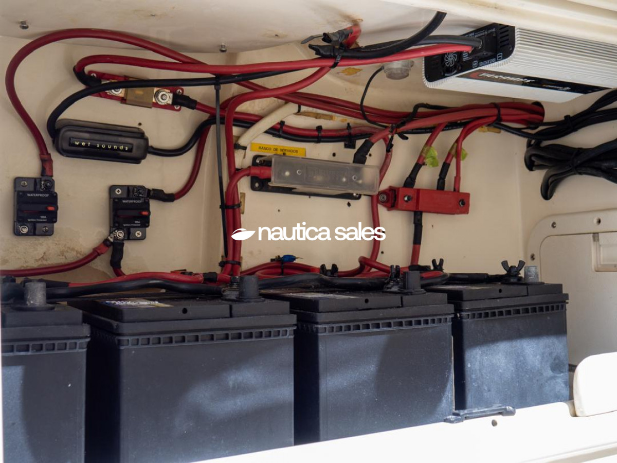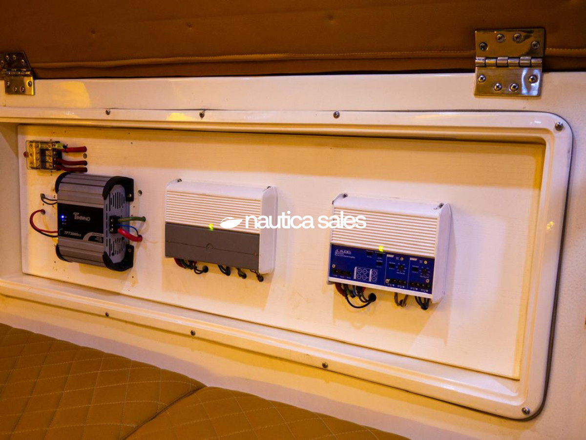 La lancha tiene área social en popa con asientos en excelente estado, toldo rebatible, equipo de sonido y cornetas JL Audio; el centro de mando está ubicado estribor con todos sus equipos de navegación: relojería, radio VHF Icom, GPS Garmin, AIS Em-trak y brújula. En proa está el camarote con aire acondicionado, salón y cocina integrada equipada con nevera, microondas, lavacopas y un baño operativo.