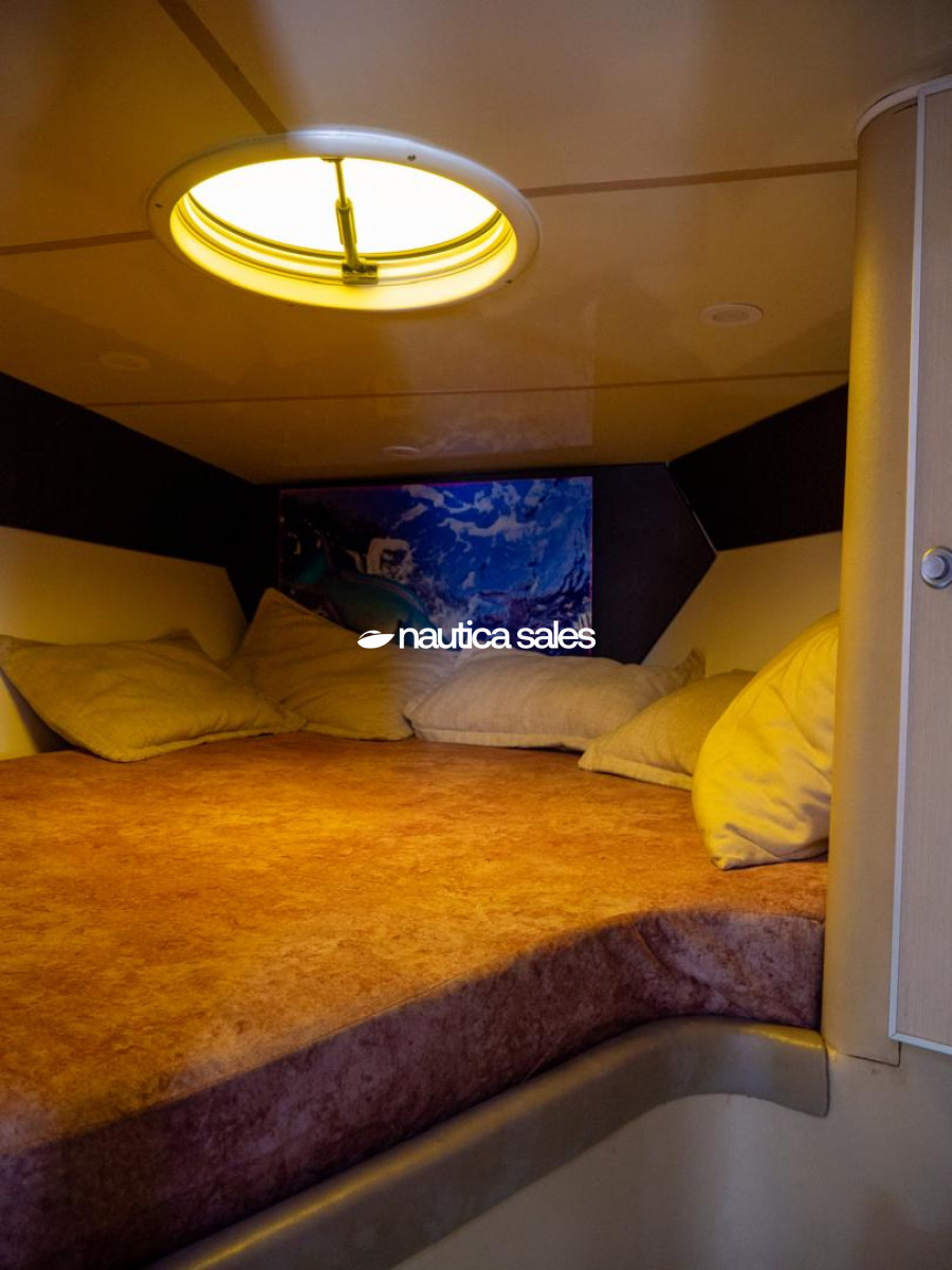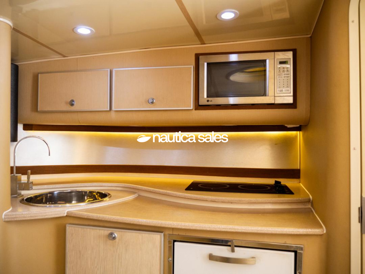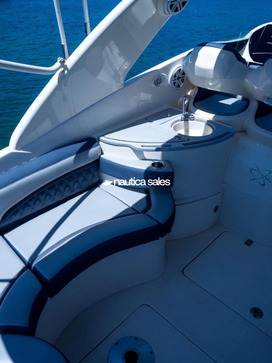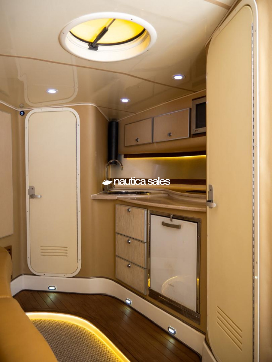 La lancha tiene área social en popa con asientos en excelente estado, toldo rebatible, equipo de sonido y cornetas JL Audio; el centro de mando está ubicado estribor con todos sus equipos de navegación: relojería, radio VHF Icom, GPS Garmin, AIS Em-trak y brújula. En proa está el camarote con aire acondicionado, salón y cocina integrada equipada con nevera, microondas, lavacopas y un baño operativo.