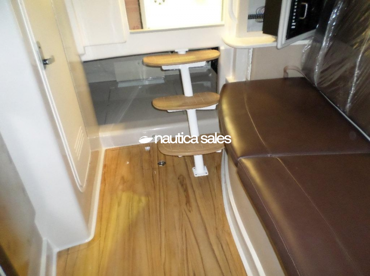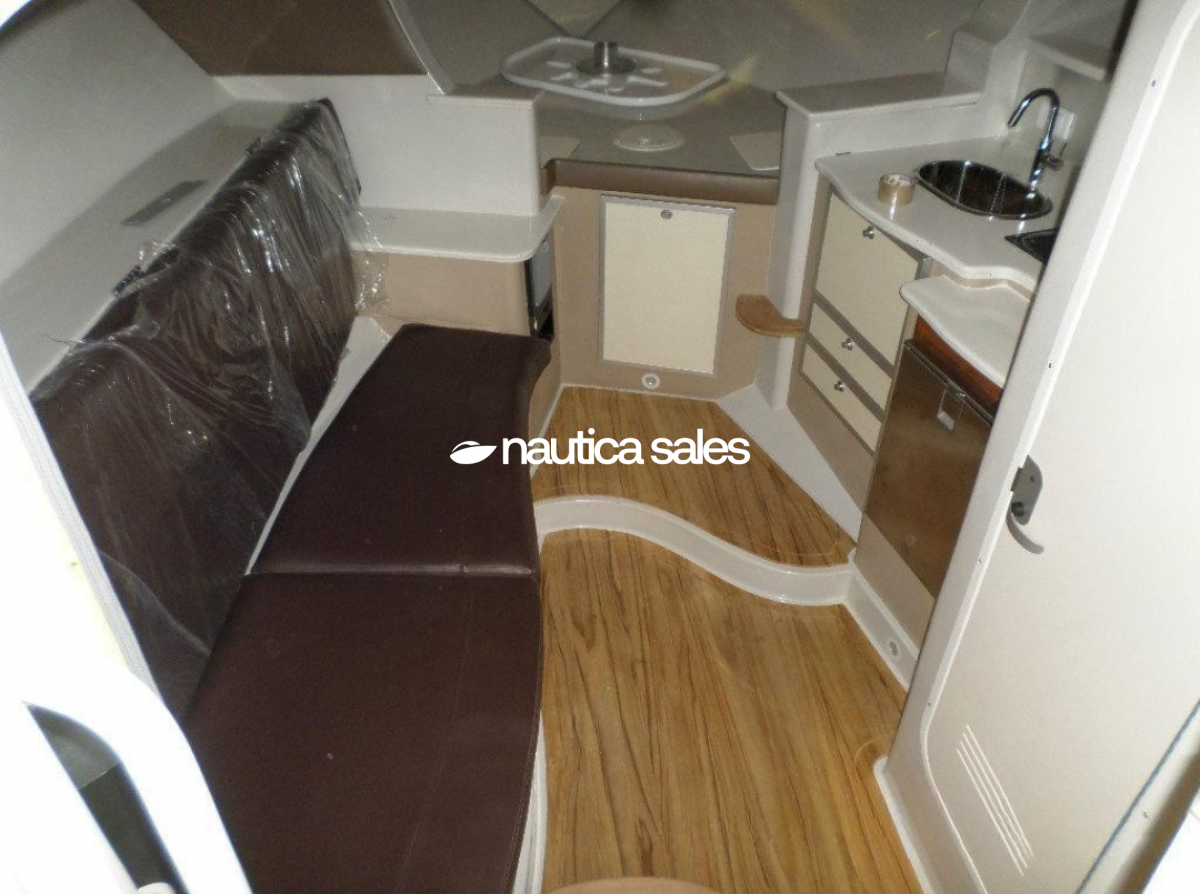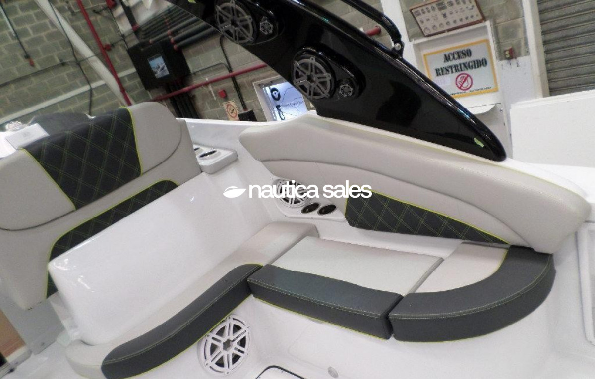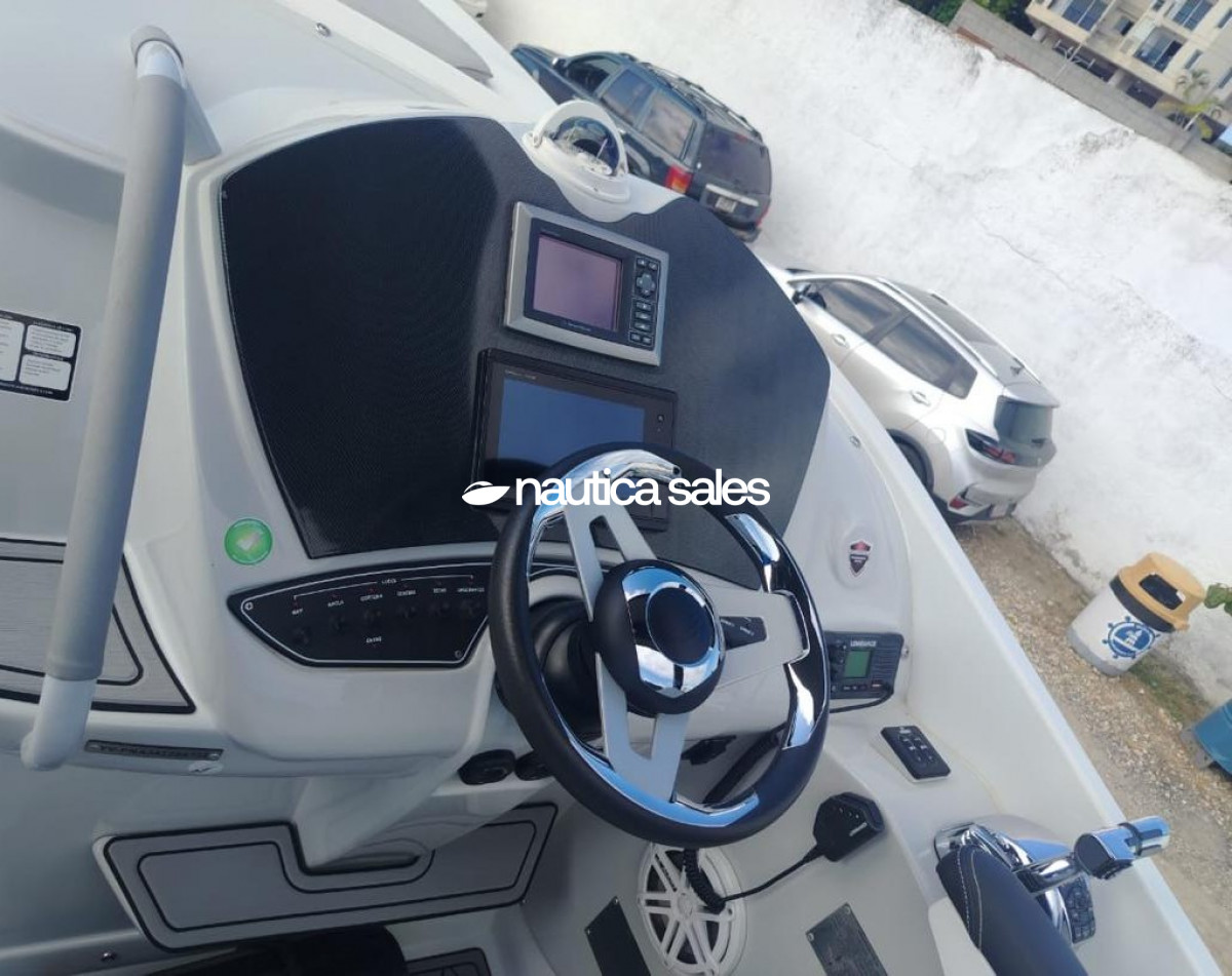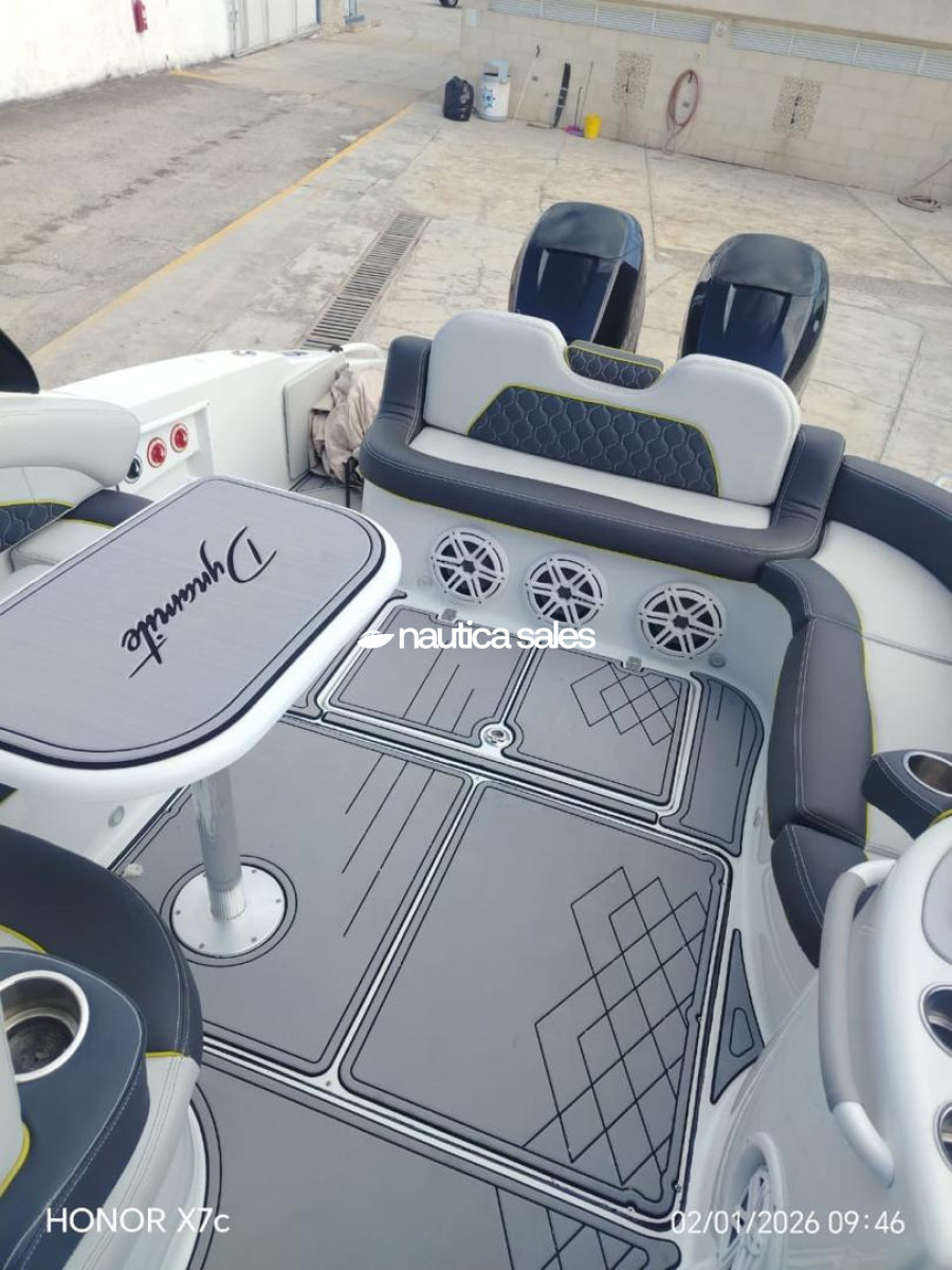 La lancha tiene área social en popa con asientos en excelente estado, piso Sea deck, sonido JL Audio con 4 bajos y 10 cornetas; el centro de mando está ubicado estribor con todos sus equipos de navegación (GPS Garmin). En proa está el camarote con aire acondicionado, salón y cocina integrada equipada con nevera, microondas, lavacopas y un baño operativo. Además la embarcación tiene televisor Samsung, Play Station y un trailer triple eje.