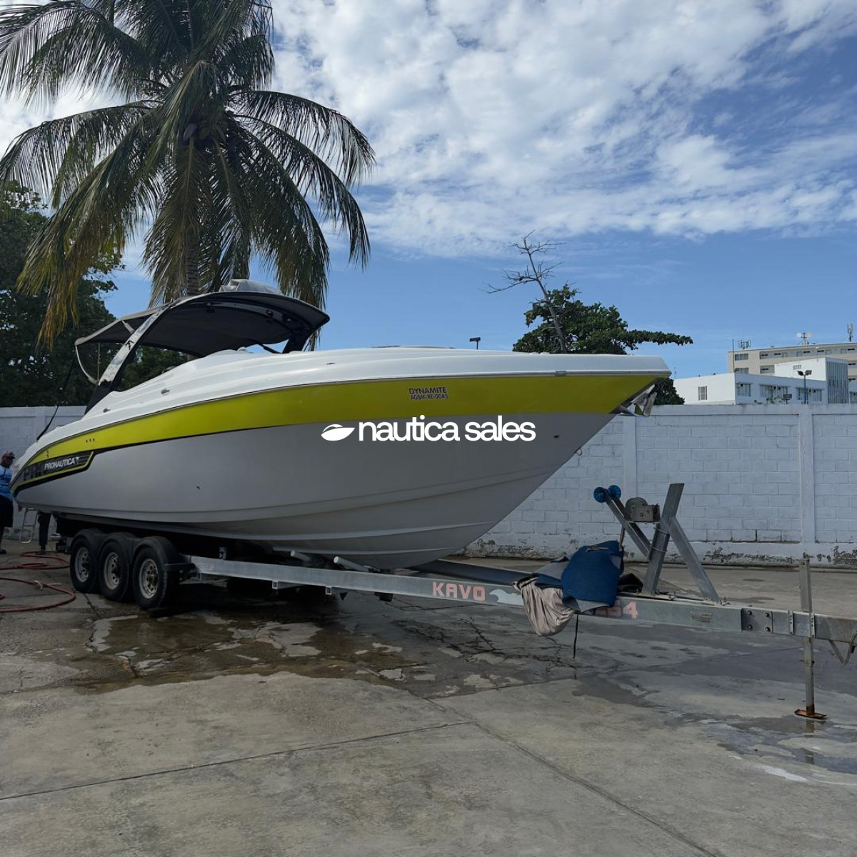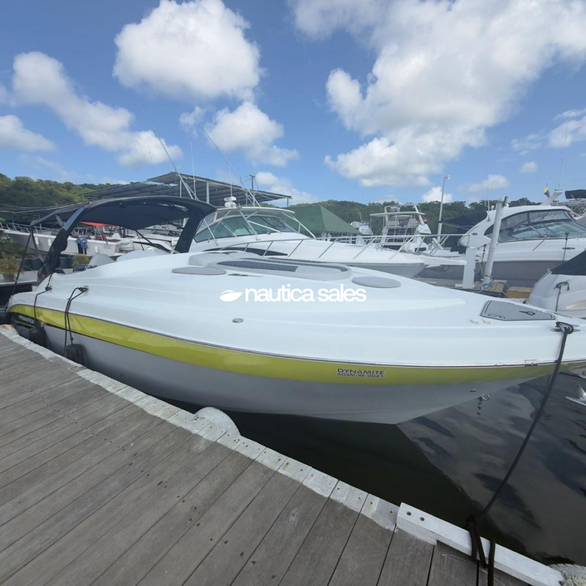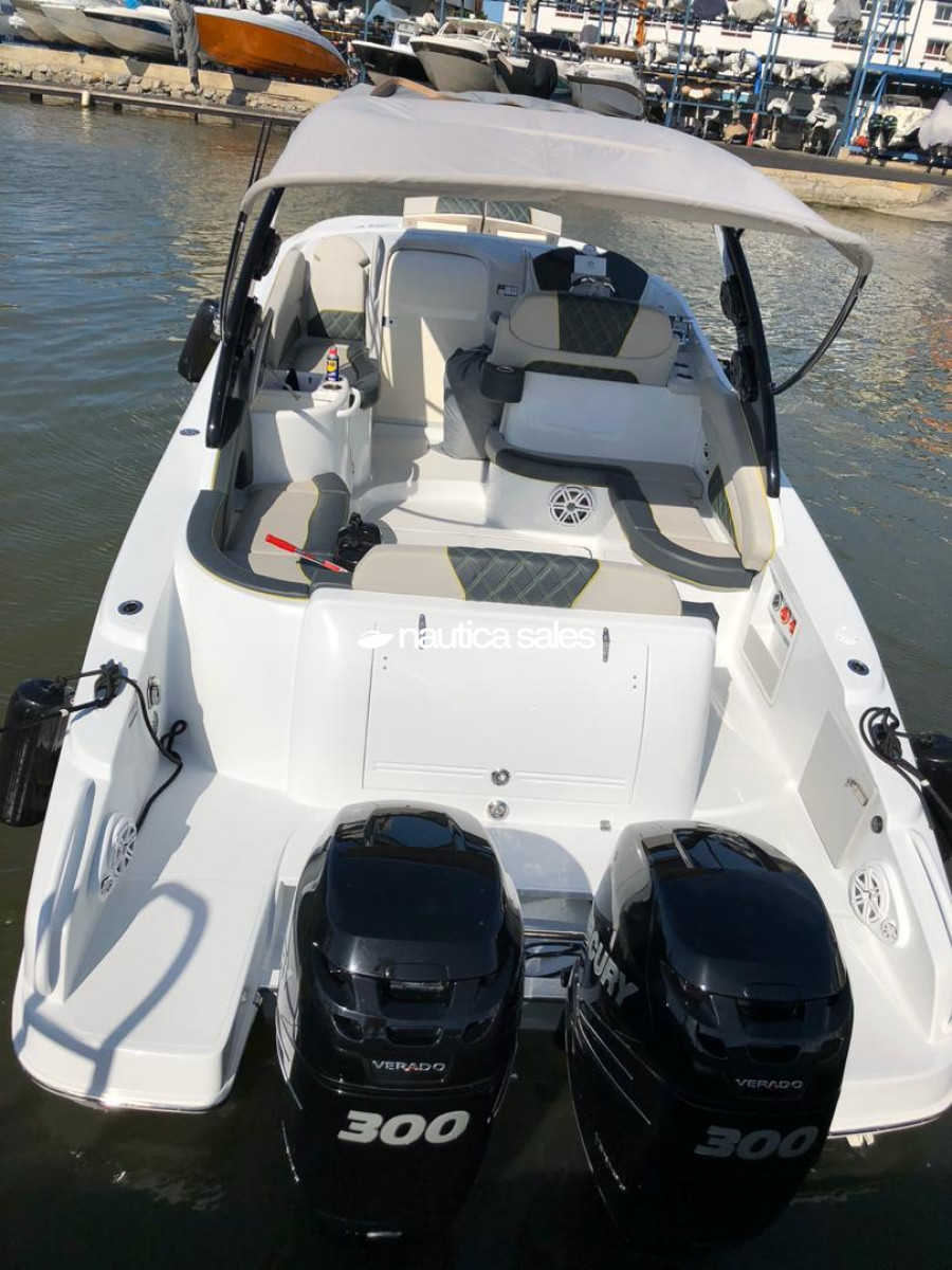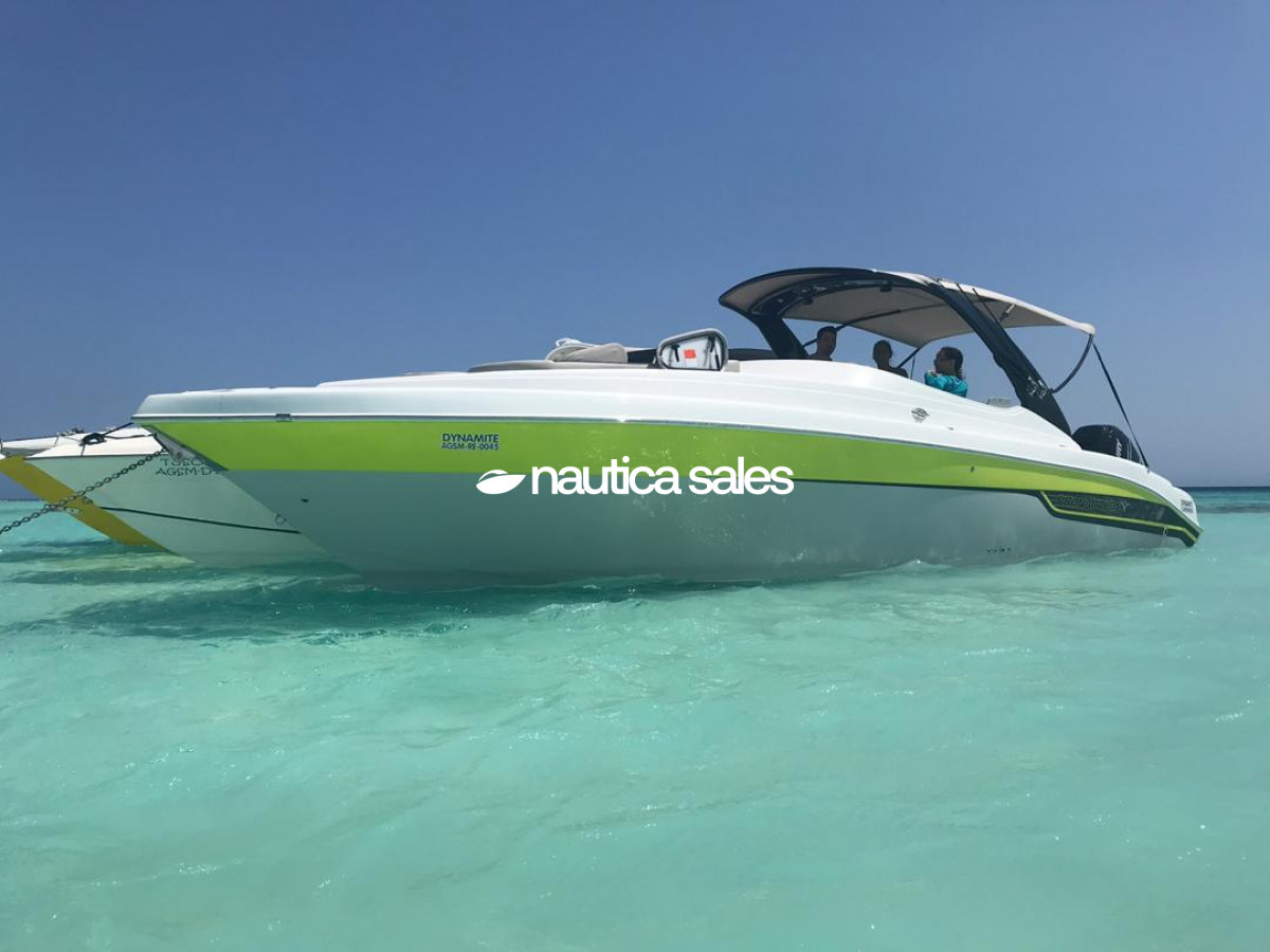 La lancha tiene área social en popa con asientos en excelente estado, piso Sea deck, sonido JL Audio con 4 bajos y 10 cornetas; el centro de mando está ubicado estribor con todos sus equipos de navegación (GPS Garmin). En proa está el camarote con aire acondicionado, salón y cocina integrada equipada con nevera, microondas, lavacopas y un baño operativo. Además la embarcación tiene televisor Samsung, Play Station y un trailer triple eje.