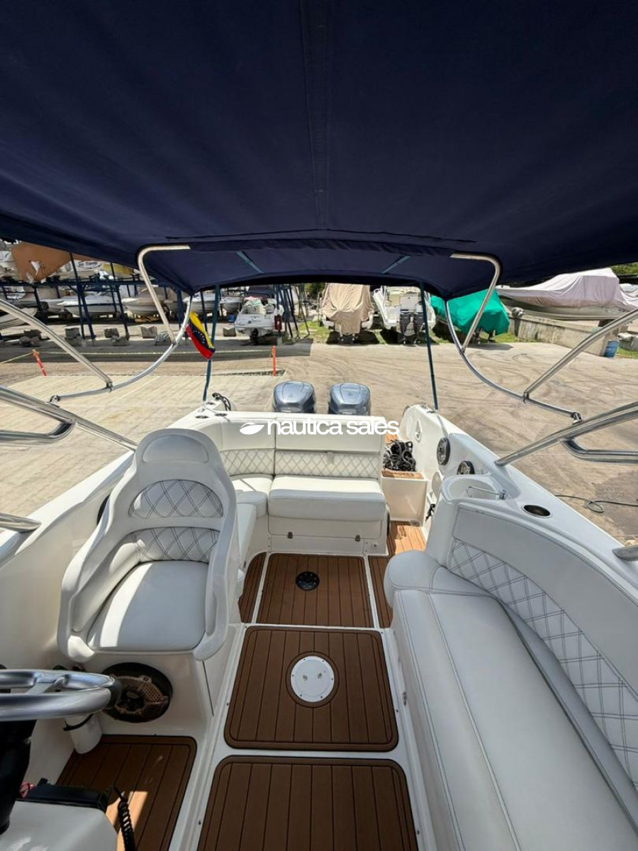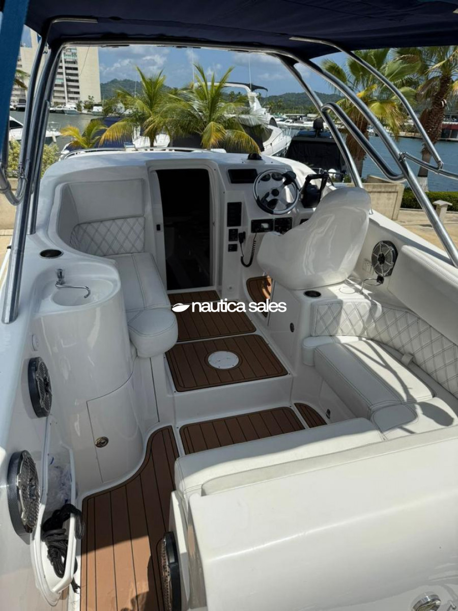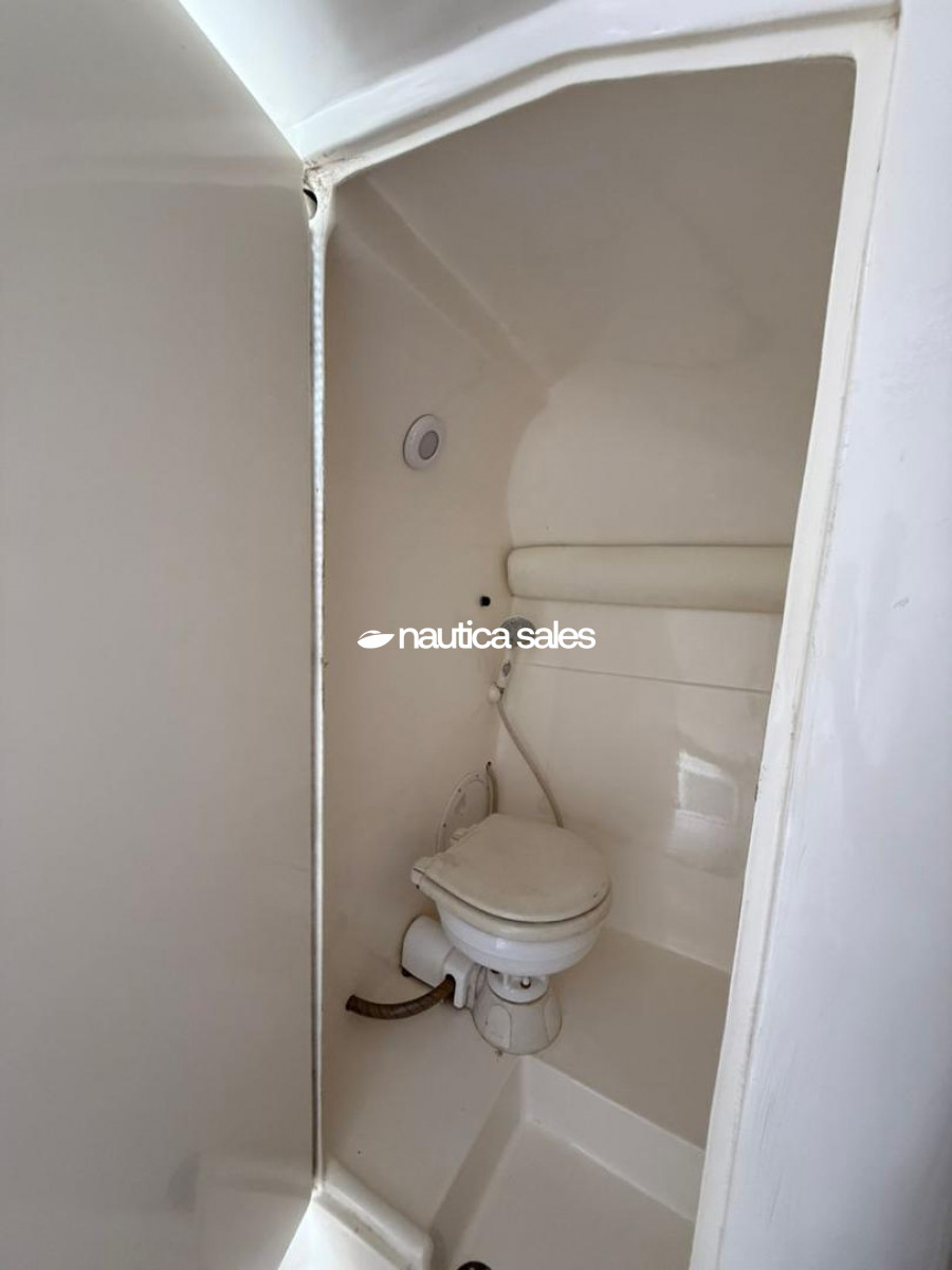 El casco se encuentra en excelente condición; el área social de popa tiene butacas con tapicería (reciente) de color blanco en buen estado al igual que la lona y la estructura tubular del toldo, lavacopas y piso antiresbalante. El centro de mando está ubicado a estribor y tiene relojería, radio VHF Icom nuevo, GPS Garmin nuevo y brújula.