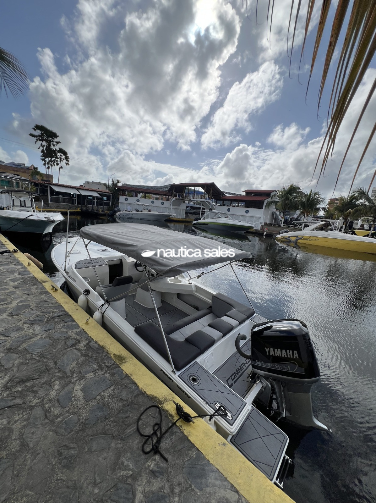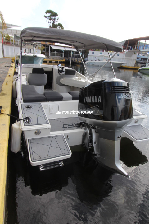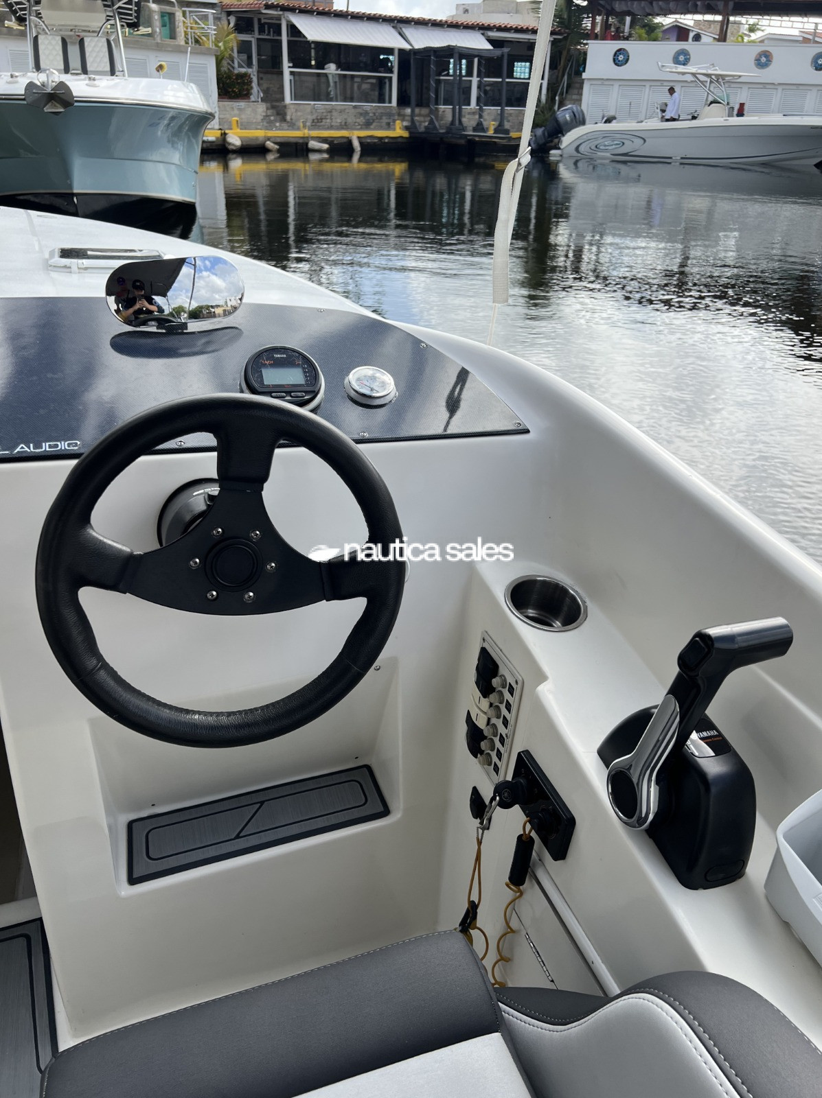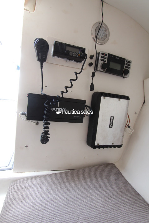 La lancha con consola a estribor, relojería y mandos Yamaha, cuenta con radio VHF marca Icom, antena Shakespeare con base de acero inoxidable y reproductor de sonido con Clarion con 5 cornetas y un bajo JL Audio distribuidas por el área social de popa.