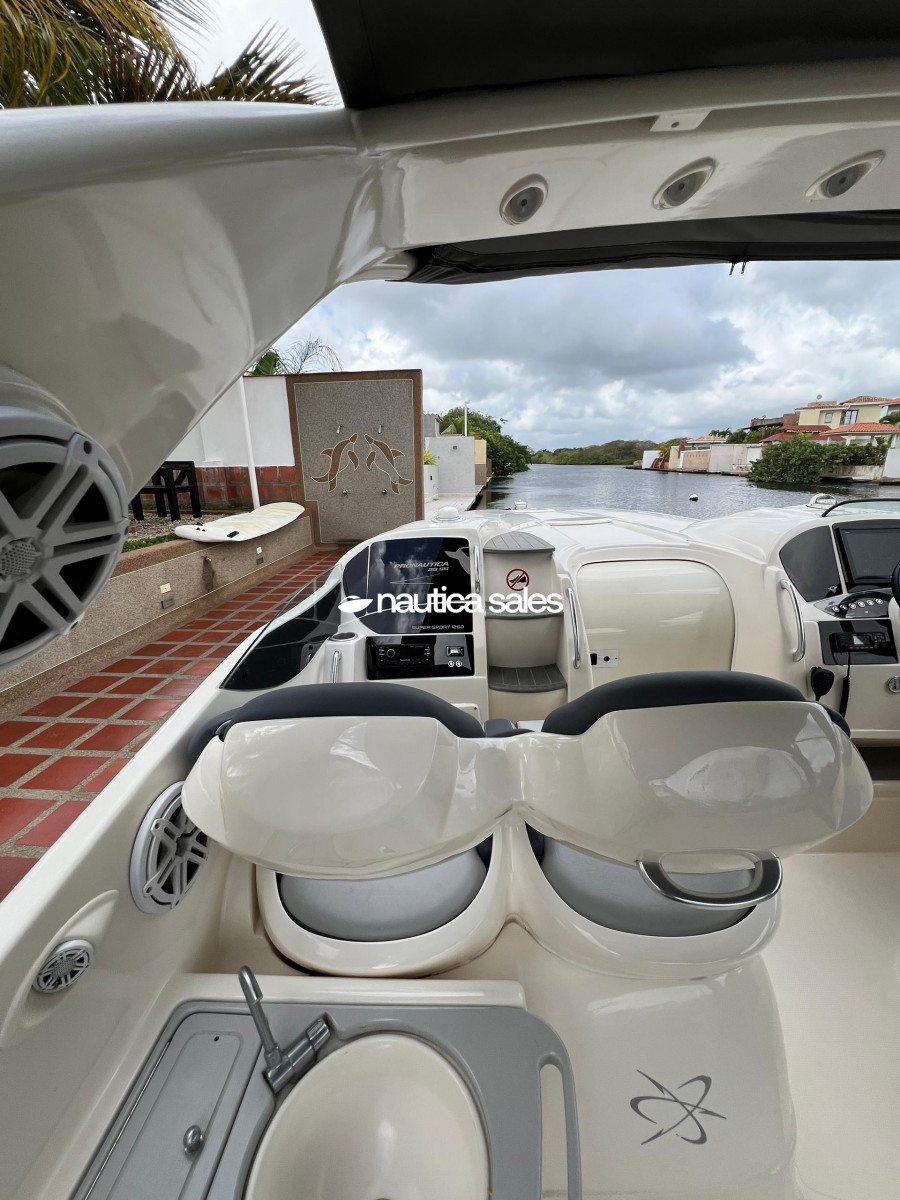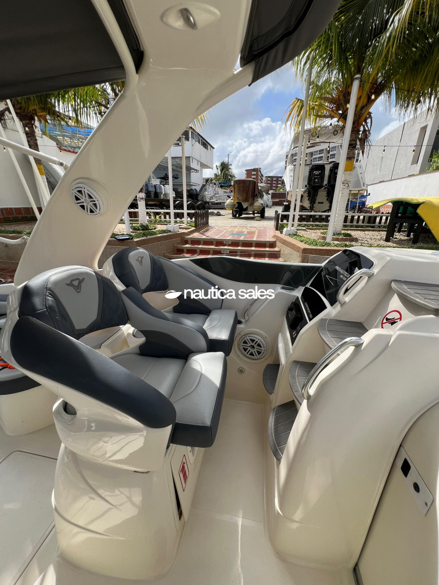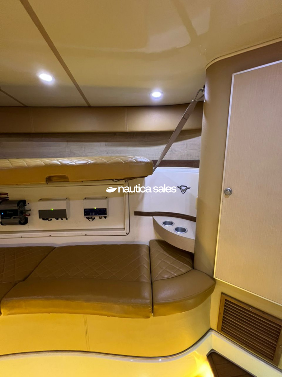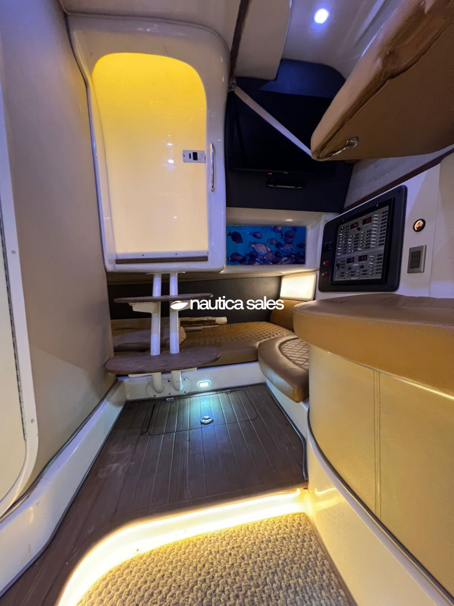 La lancha tiene área social en popa con asientos en excelente estado, toldo rebatible, equipo de sonido y cornetas JL Audio; el centro de mando está ubicado estribor con todos sus equipos de navegación: relojería, radio VHF Icom, GPS Garmin, AIS Em-trak y brújula. En proa está el camarote con aire acondicionado, salón y cocina integrada equipada con nevera, microondas, lavacopas y un baño operativo.