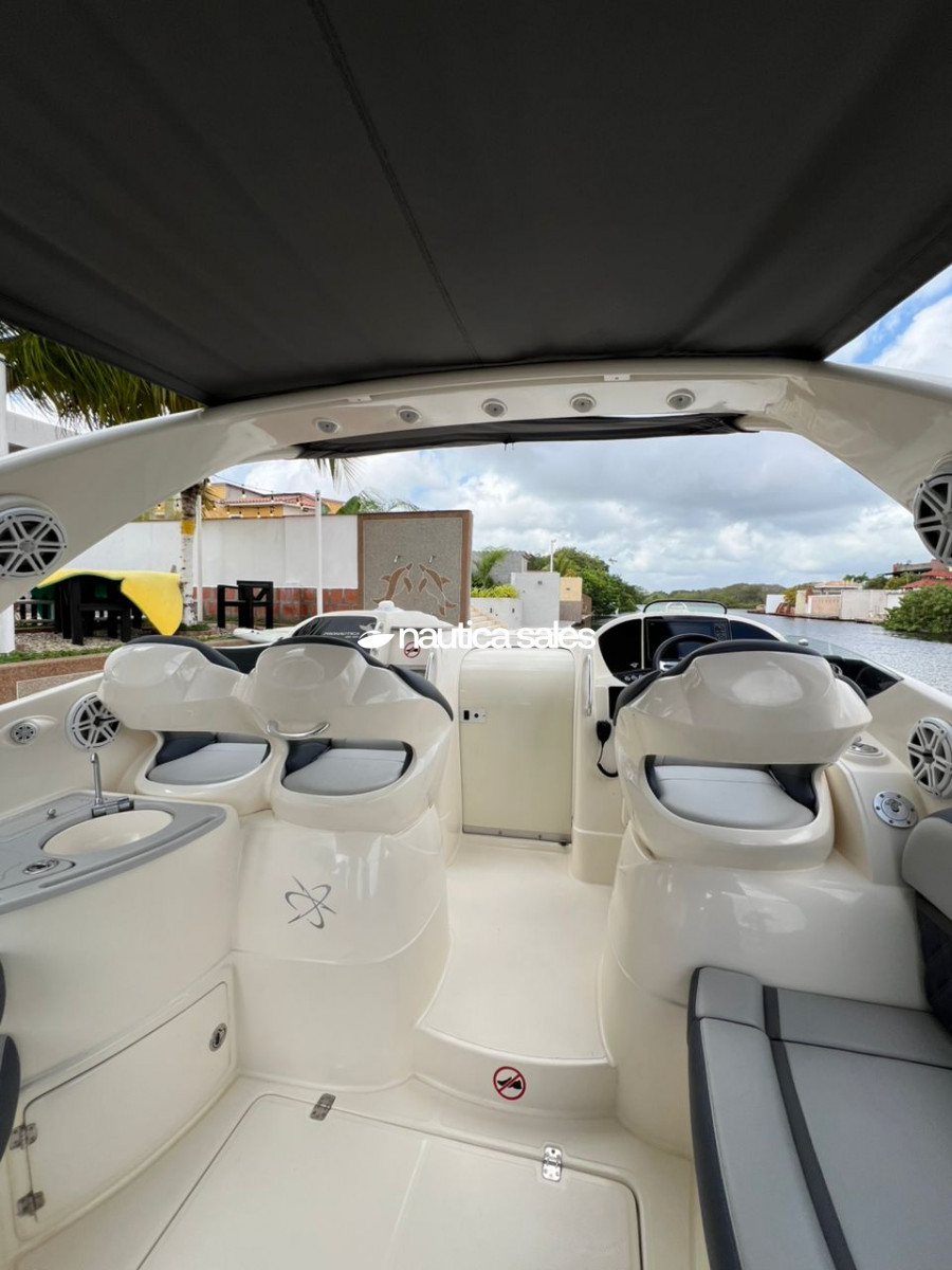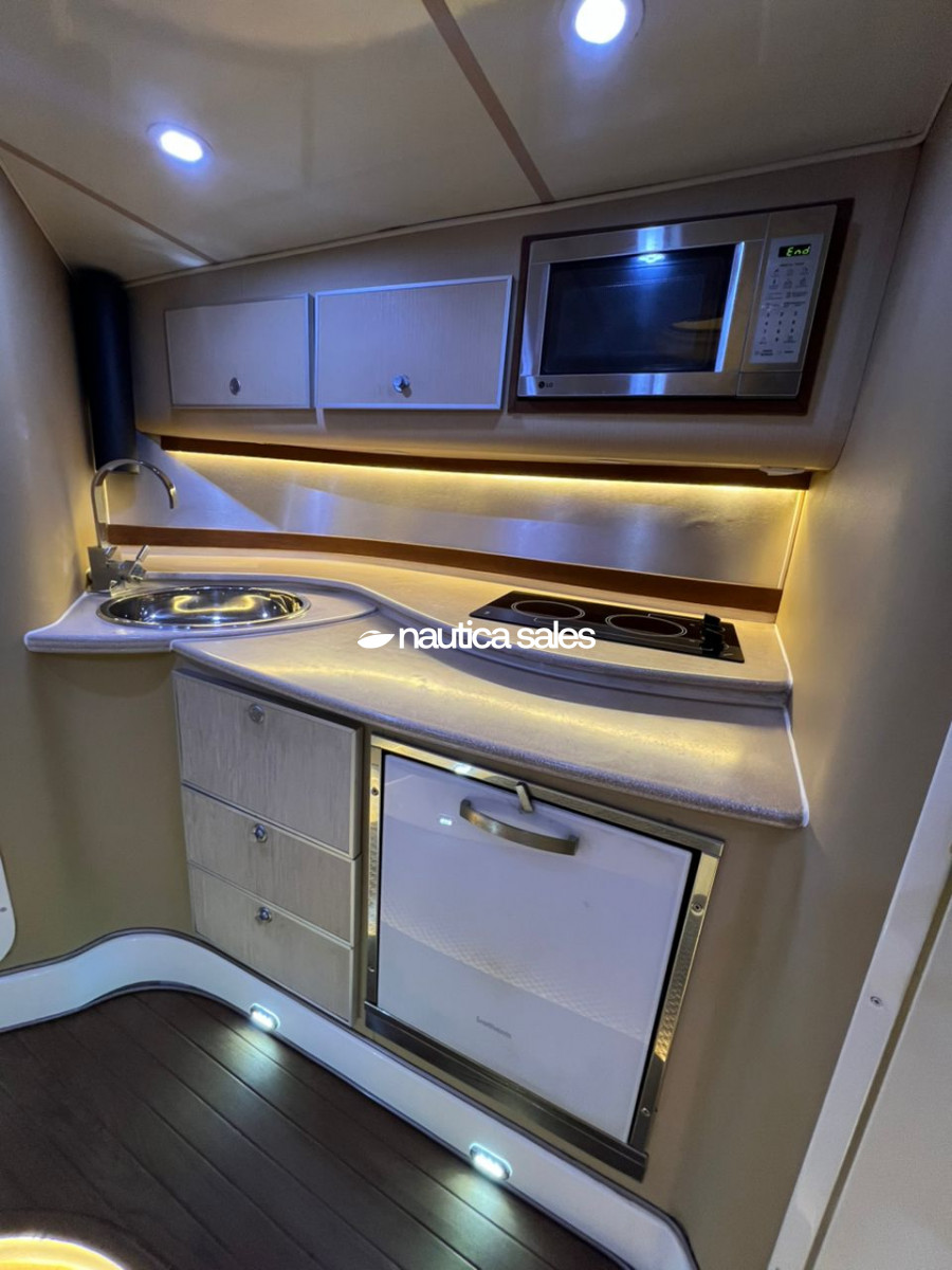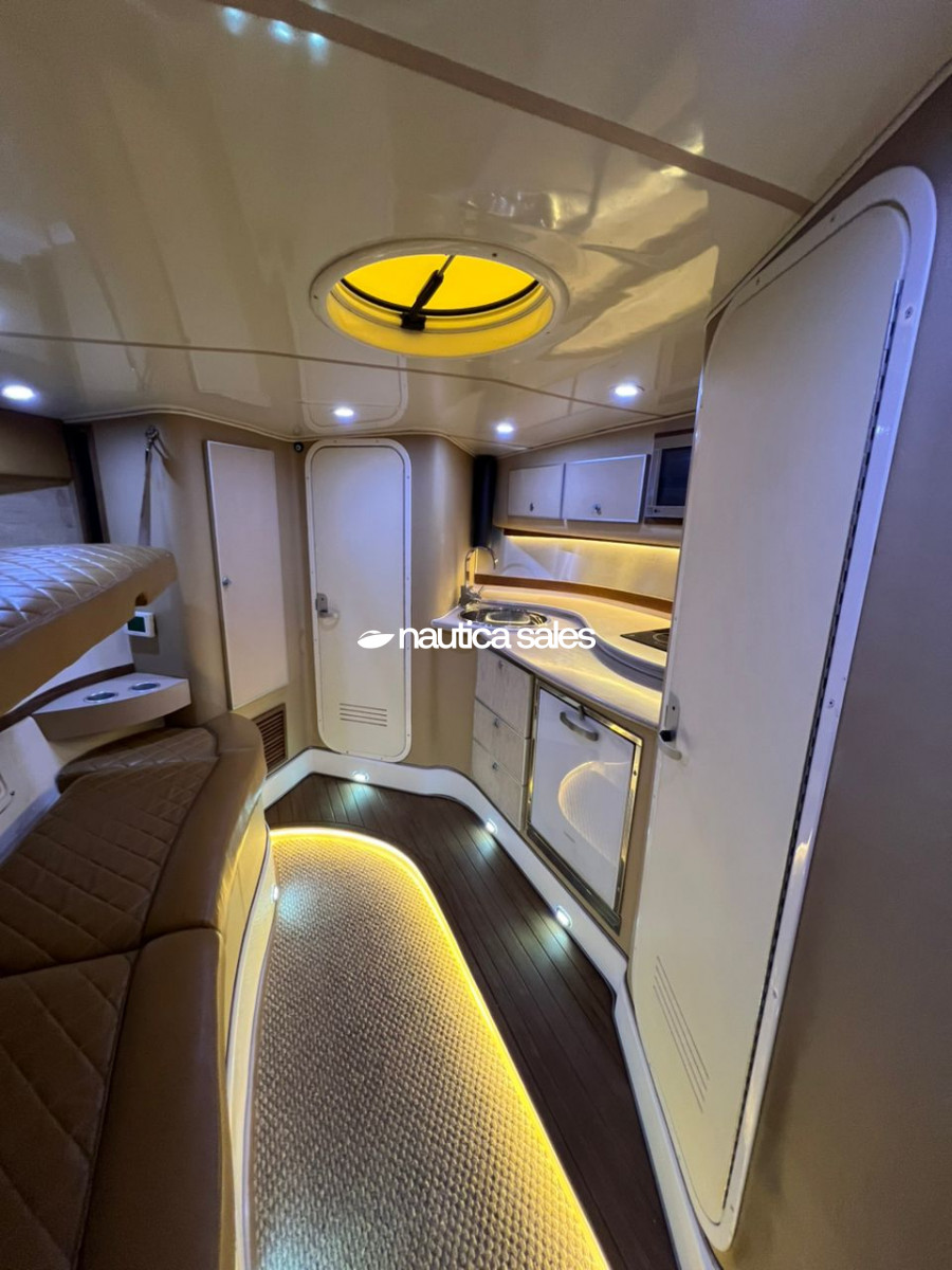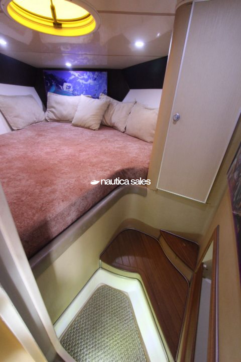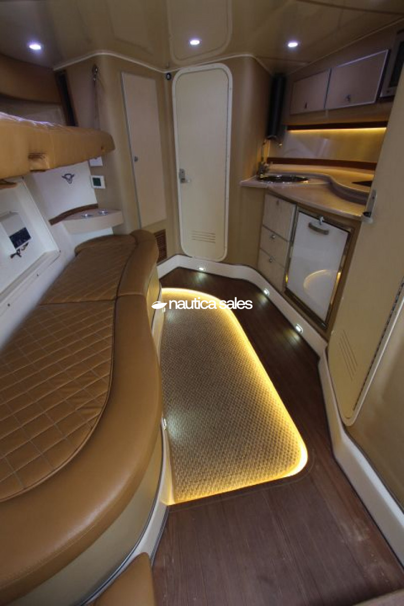 La lancha tiene área social en popa con asientos en excelente estado, toldo rebatible, equipo de sonido y cornetas JL Audio; el centro de mando está ubicado estribor con todos sus equipos de navegación: relojería, radio VHF Icom, GPS Garmin, AIS Em-trak y brújula. En proa está el camarote con aire acondicionado, salón y cocina integrada equipada con nevera, microondas, lavacopas y un baño operativo.