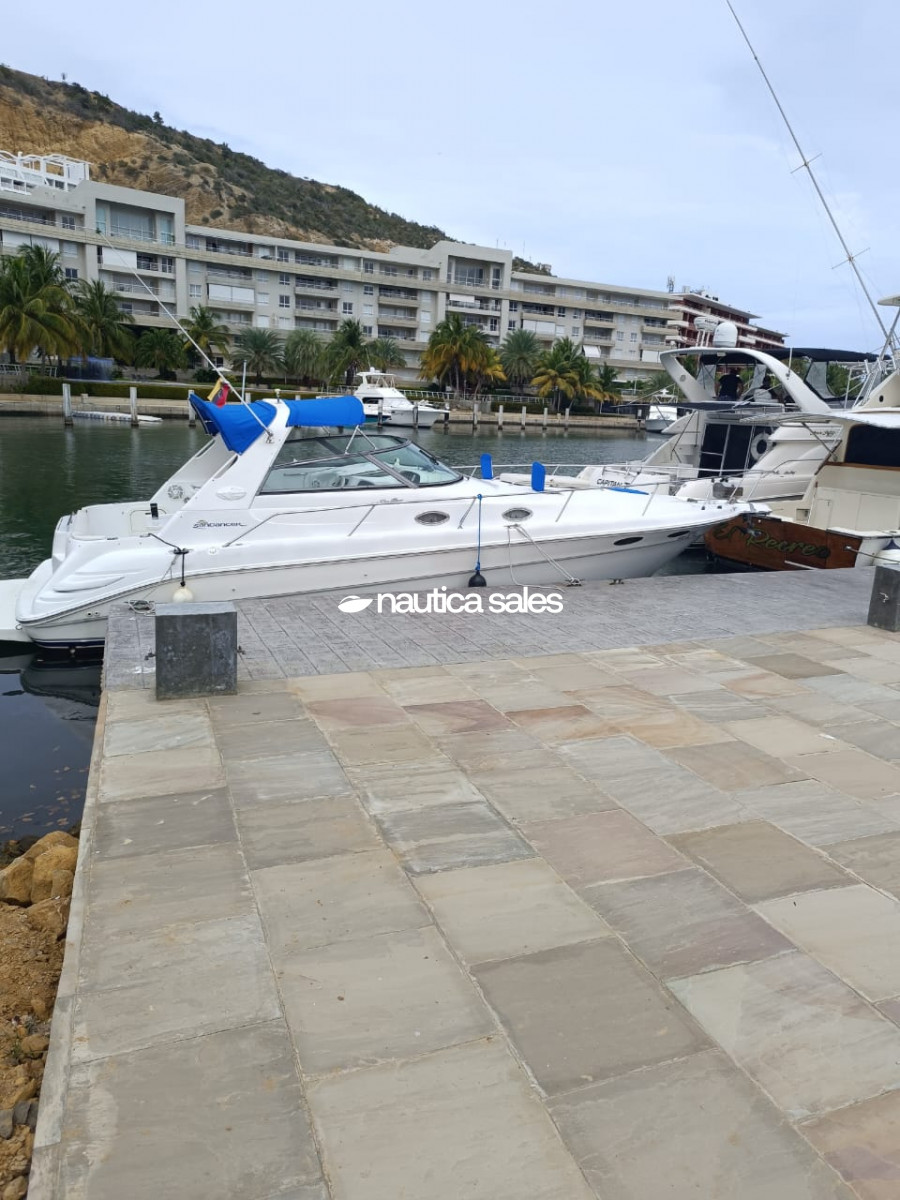 En venta Sea Ray Sundancer de 34 pies, año 2000, con dos motores Perkins Detroit de 275 caballos de fuerza, año 2000 con 200 horas de uso aproximado después de overhaul. Cuenta con planta eléctrica marca Ecoflow y dispone de un tanque de combustible con capacidad para 800 litros de gasoil y un tanque de agua de 200 litros.